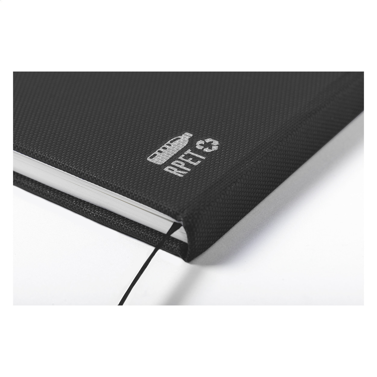 RPET poliészter borítású jegyzetfüzet 80 vonalas lappal, könyvjelzővel és gumipánttal. Méret: A5. Első borító
