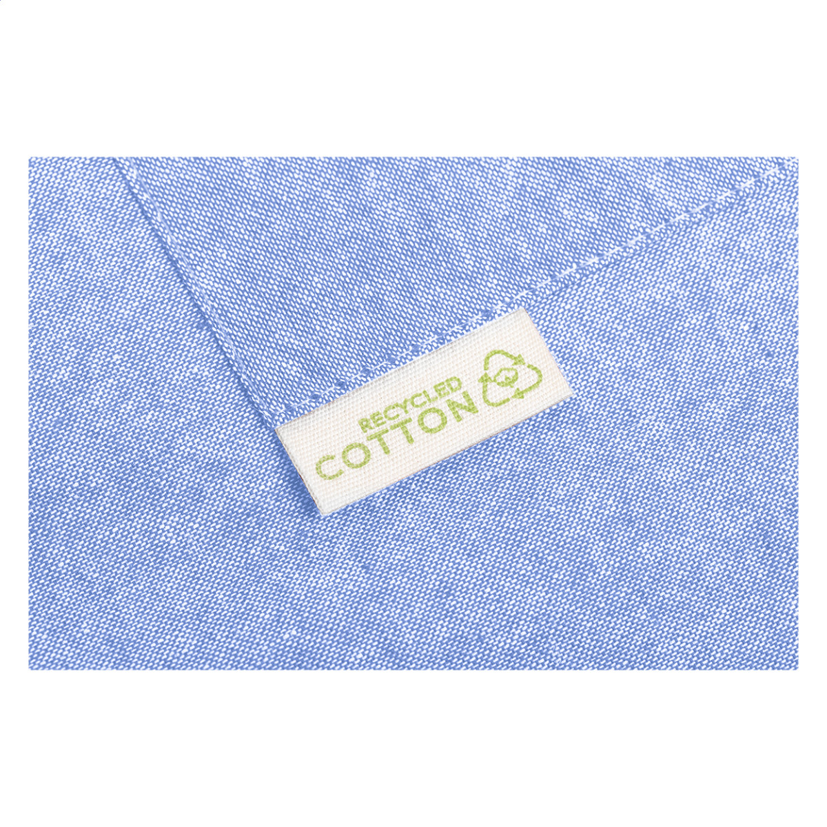 100% újrahasznosított pamutkötény elülső zsebbel, 140 g/m². Zseb fölött