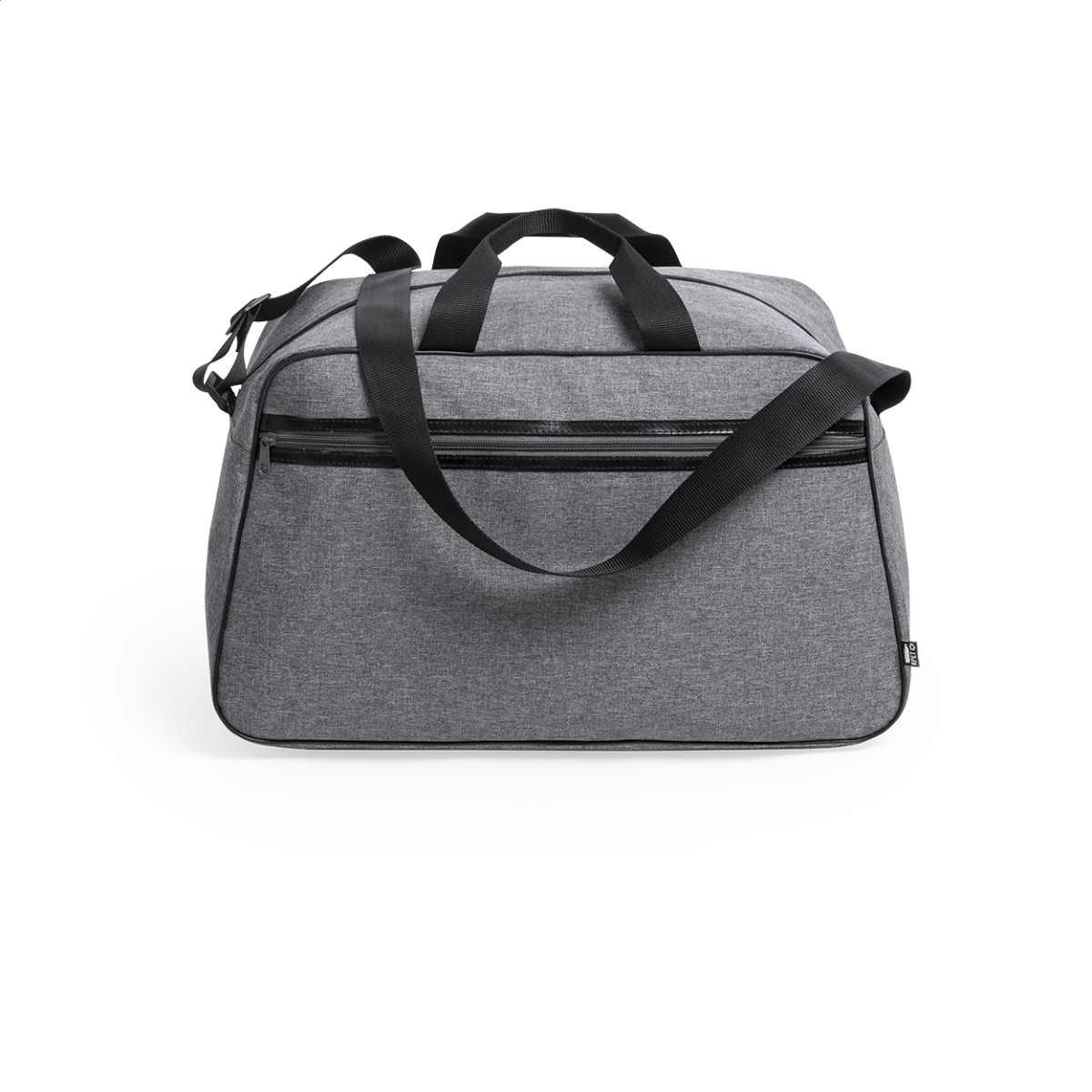 RPET sporttáska 2 cipzáras zsebbel, állítható vállpánttal PVC béléssel. Megkülönböztető RPET jelöléssel. Anyaga: 600D poliészter. Zseb alatt