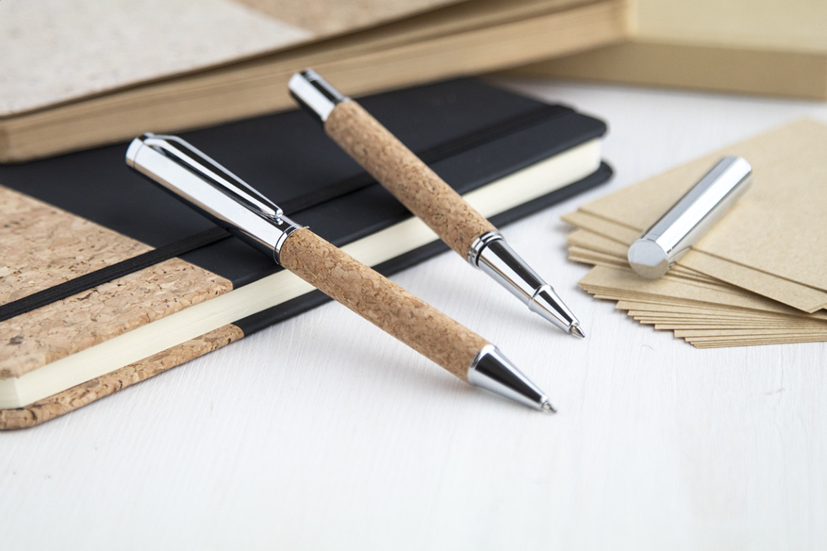 Elegáns, fém golyóstoll és rollertoll szett természetes parafa borítással. Parafa dobozban, kék tollbetéttel szállítjuk. Golyóstoll klipsz alatt - jobbkezes