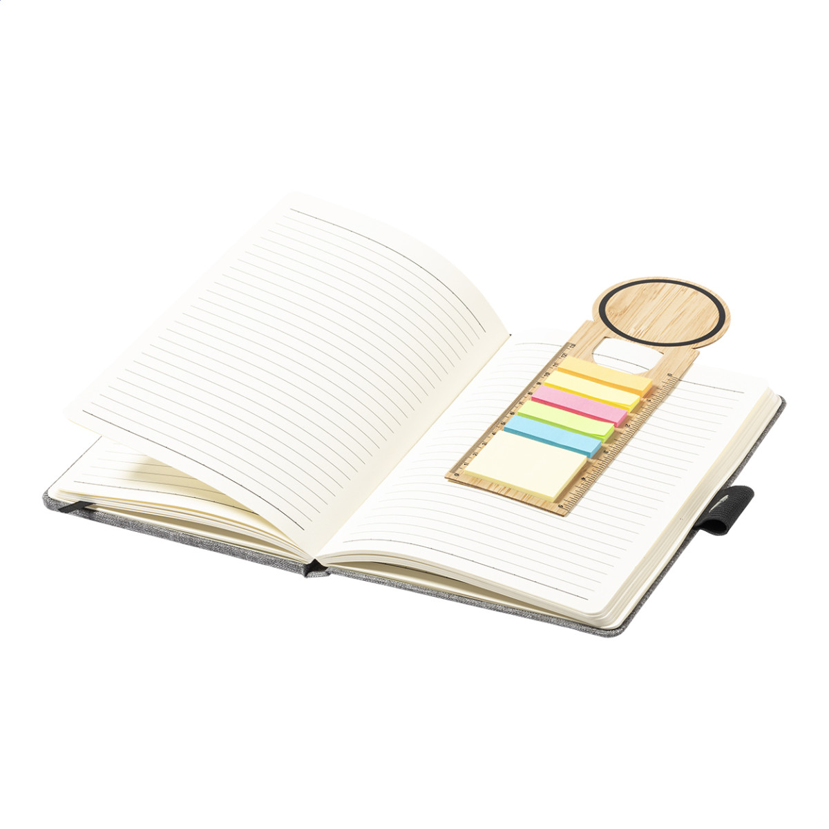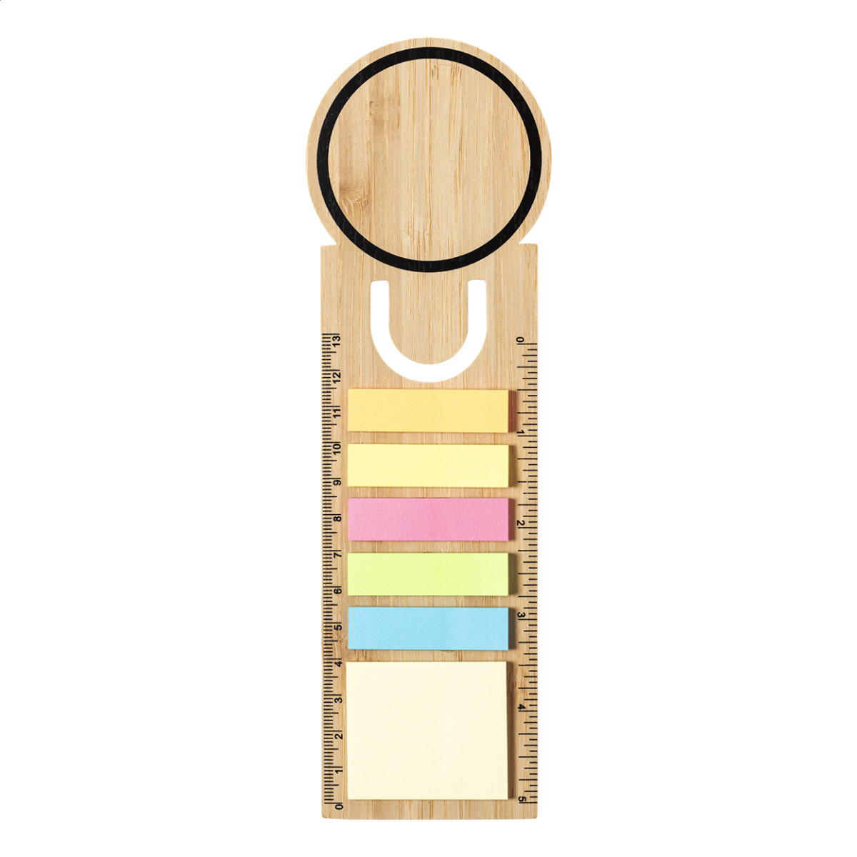 Bambusz könyvjelző vonalzóval 25 nagy és 125 kicsi öntapadós jegyzetlapokkal (5 különböző színben). Teteje