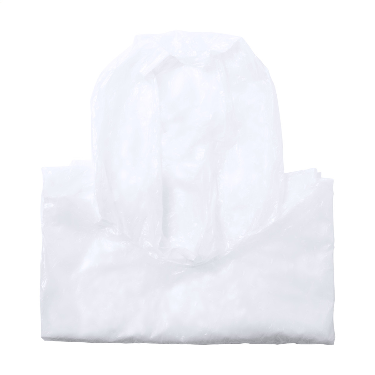 Átlátszó LDPE poncsó felnőtteknek, egy méretben. RPET poliészter hordtasakban, megkülönböztető RPET címkével és alumínium karabinerrel. Tok eleje
