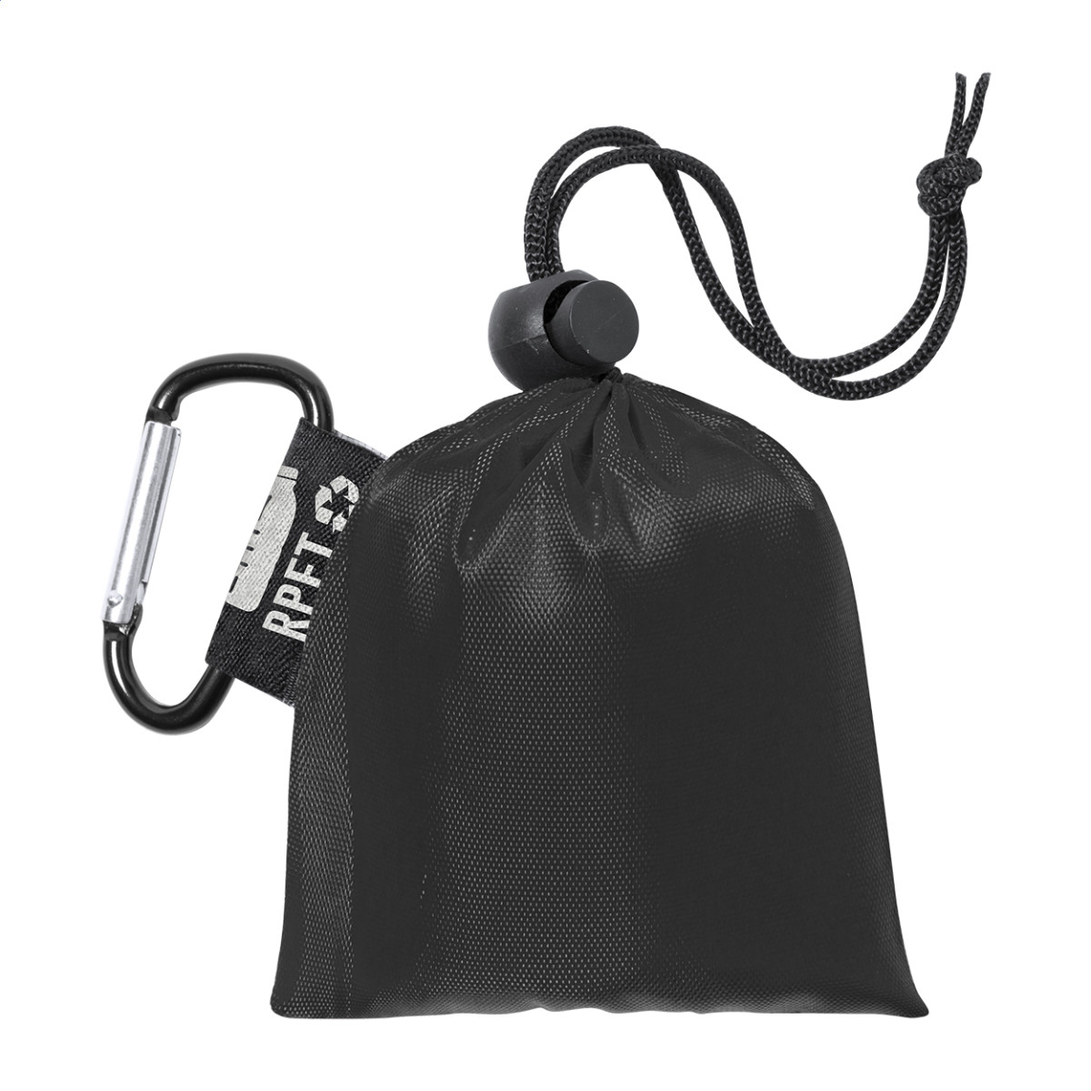 Átlátszó LDPE poncsó felnőtteknek, egy méretben. RPET poliészter hordtasakban, megkülönböztető RPET címkével és alumínium karabinerrel. Tok eleje
