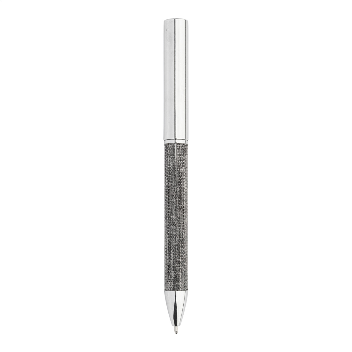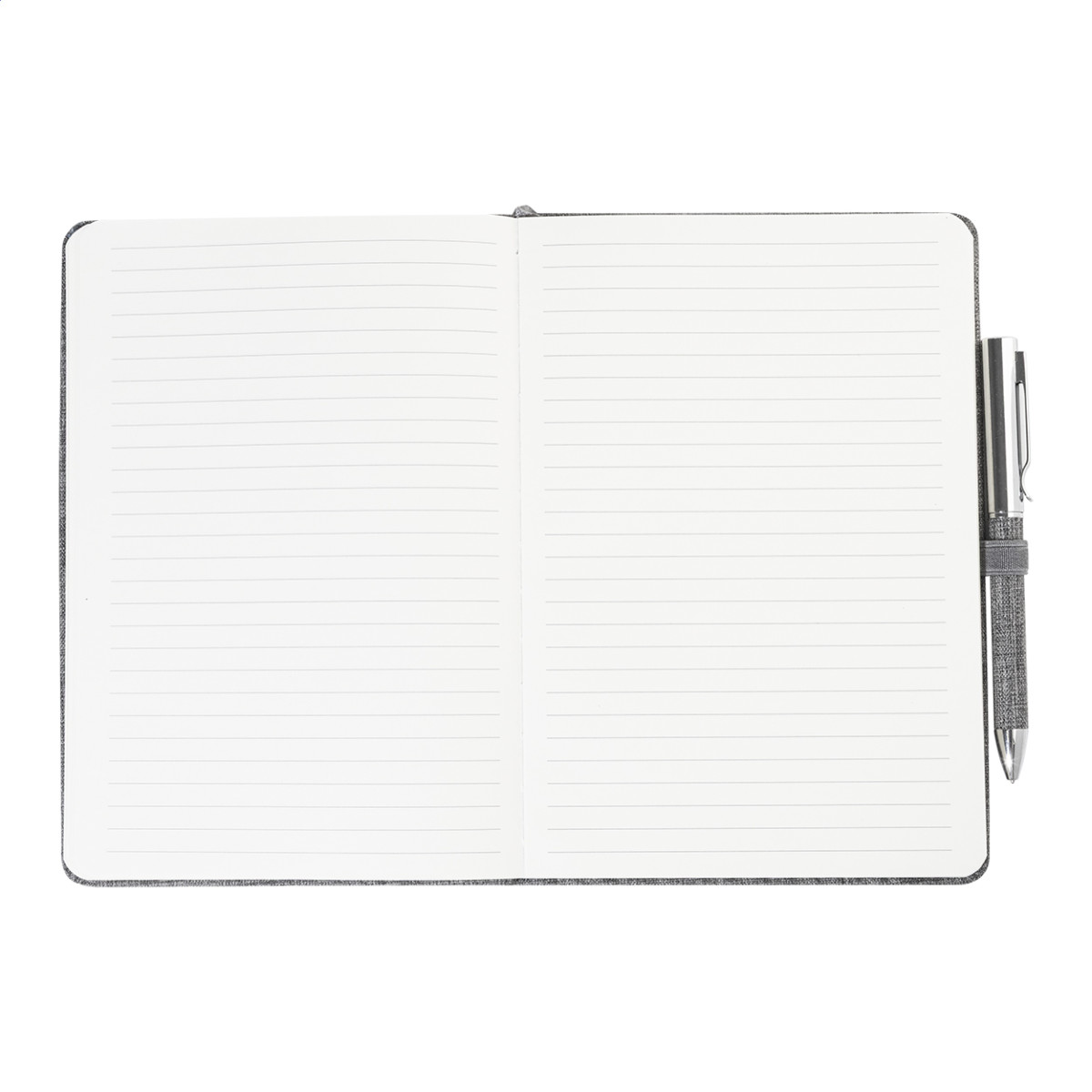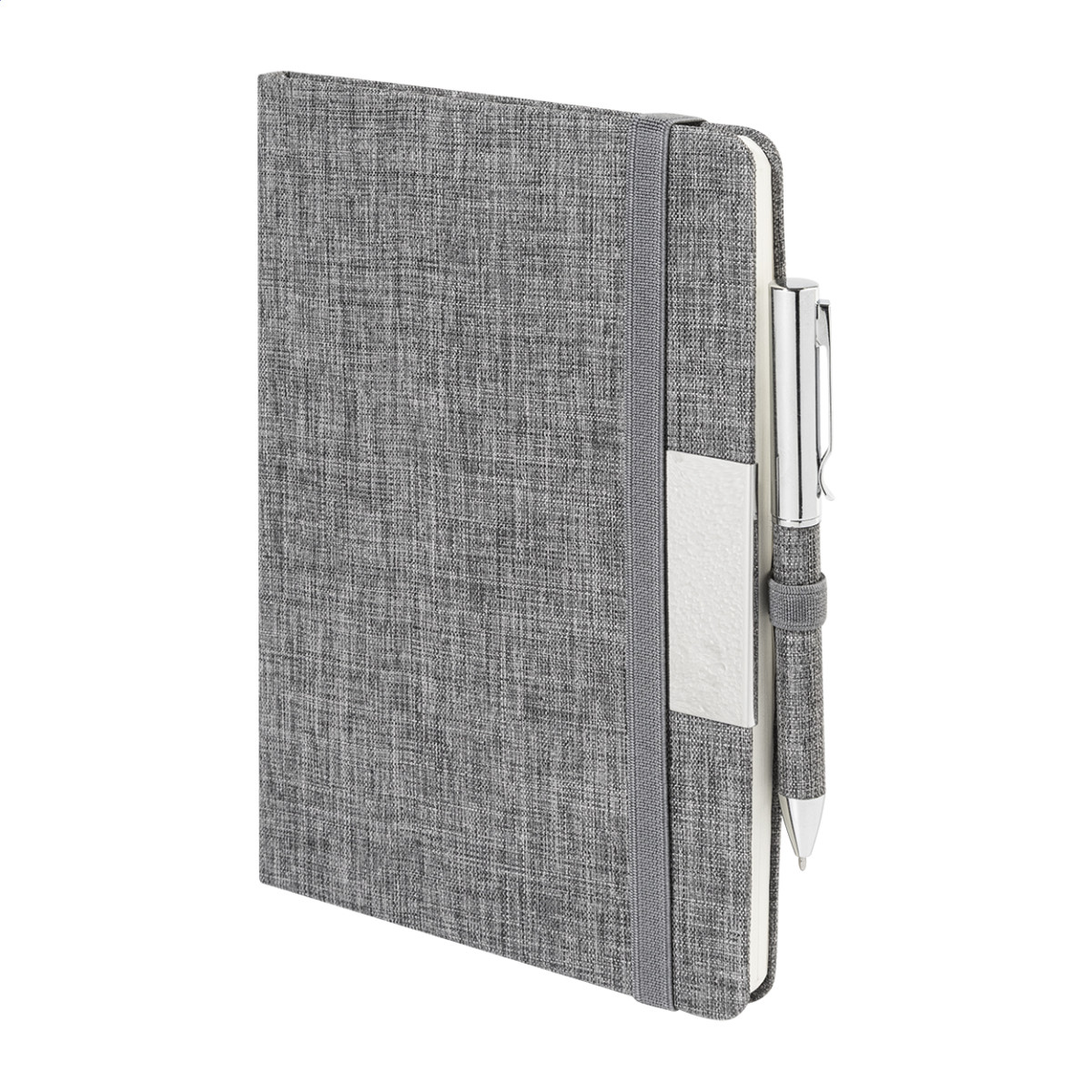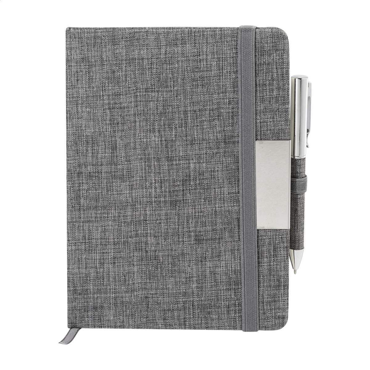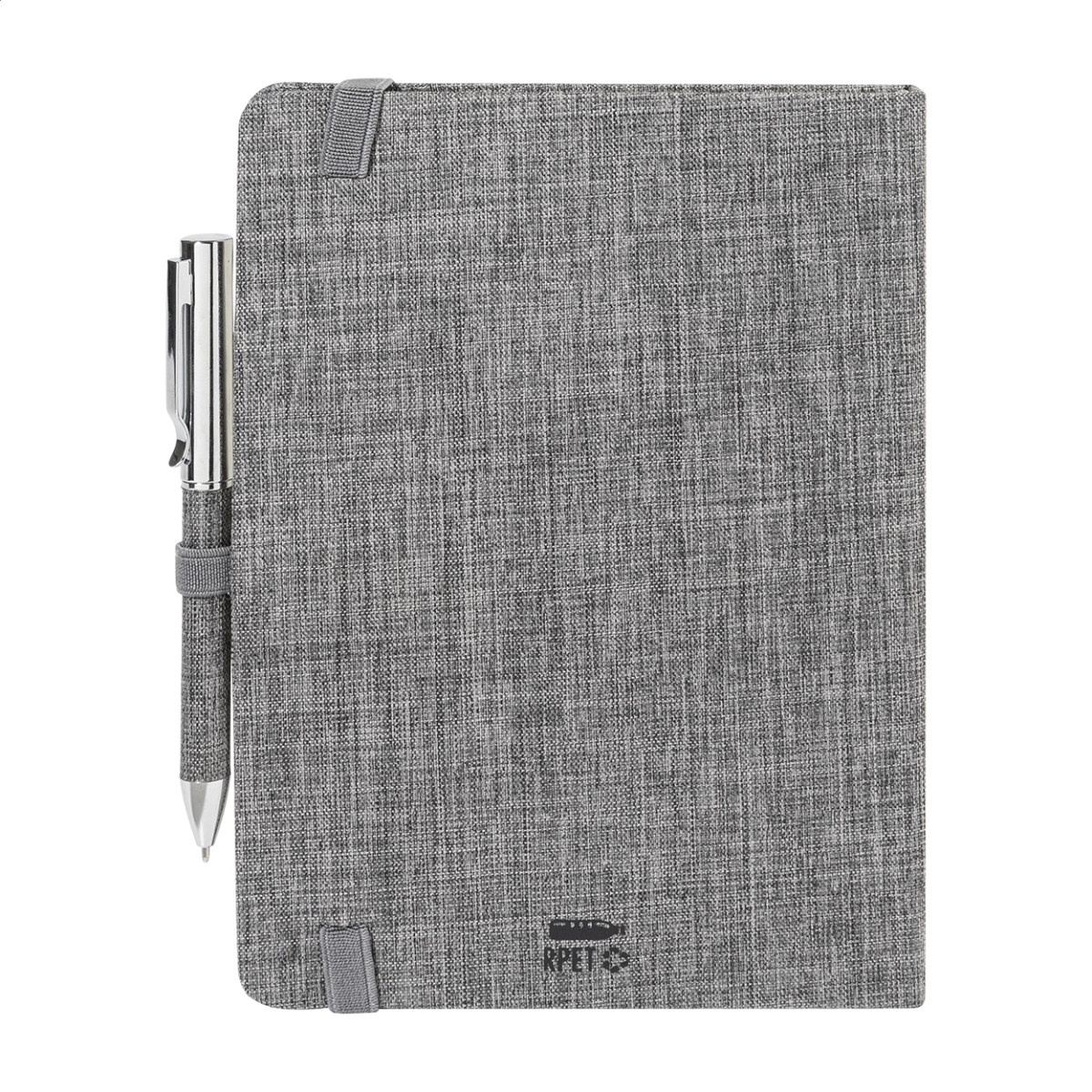 300D RPET poliészter borítású jegyzetfüzet 100 vonalas lappal és gumis pánttal. RPET poliészter borítású fém golyóstollal, kék tollbetéttel. A5 méretű. Eleje