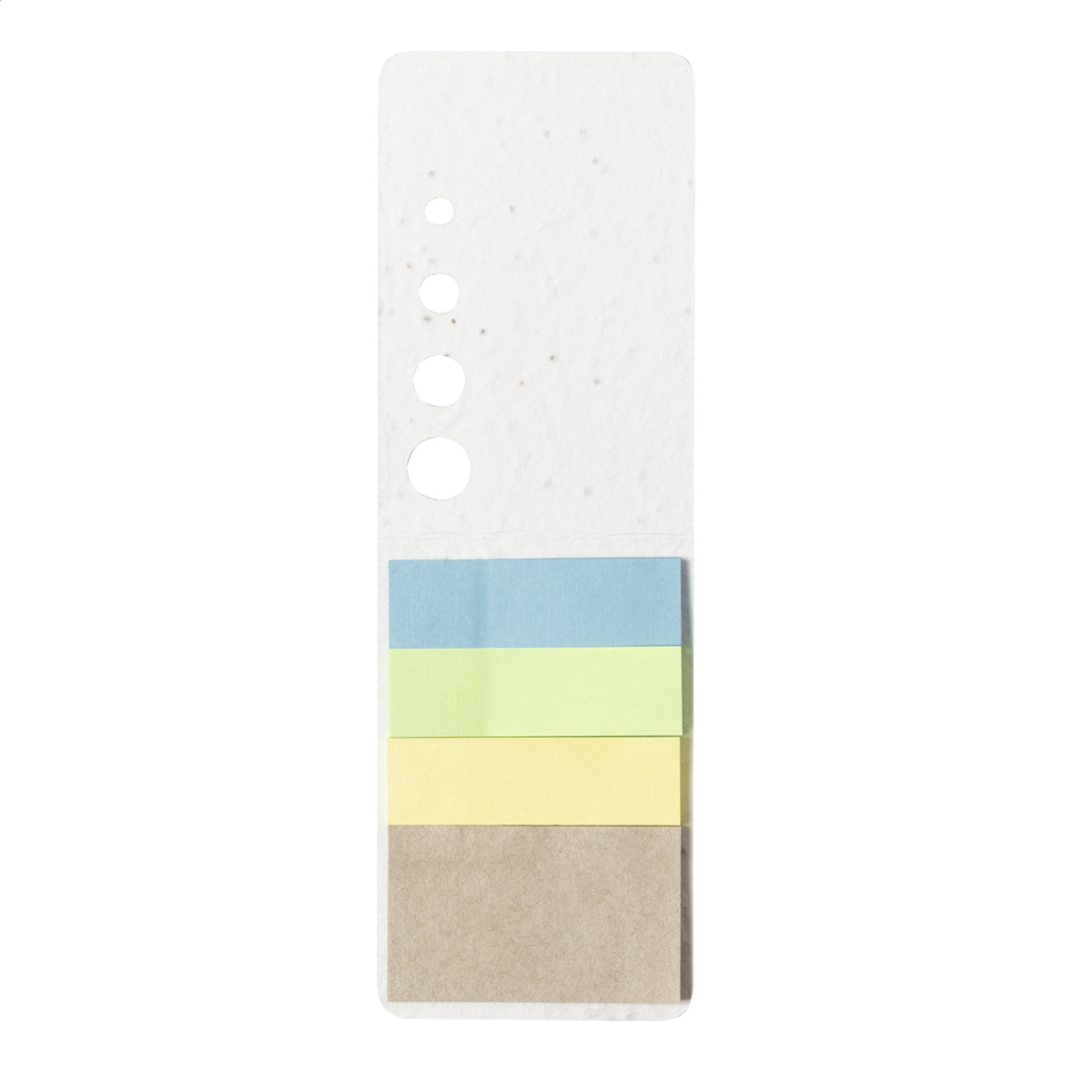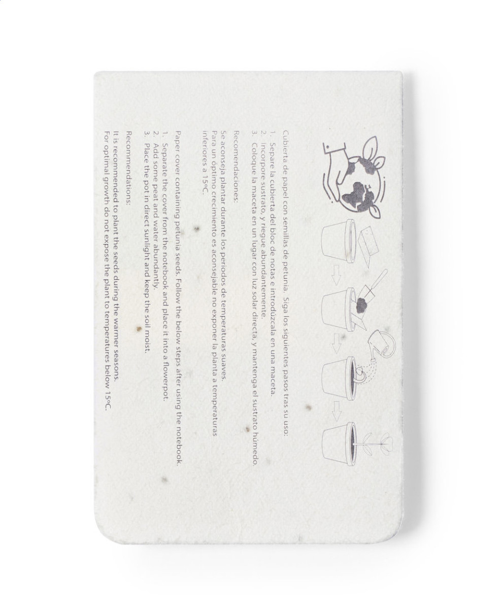 Újrahasznosított papírból készült öntapadós jegyzettömb magpapír borítóval, 10 lappal és 30 oldaljelölővel (3 különböző színben). A magpapír borító különböző vadvirág magokat tartalmaz, melyeket a borító és a füzet szétválasztása után lehet elültetni. |