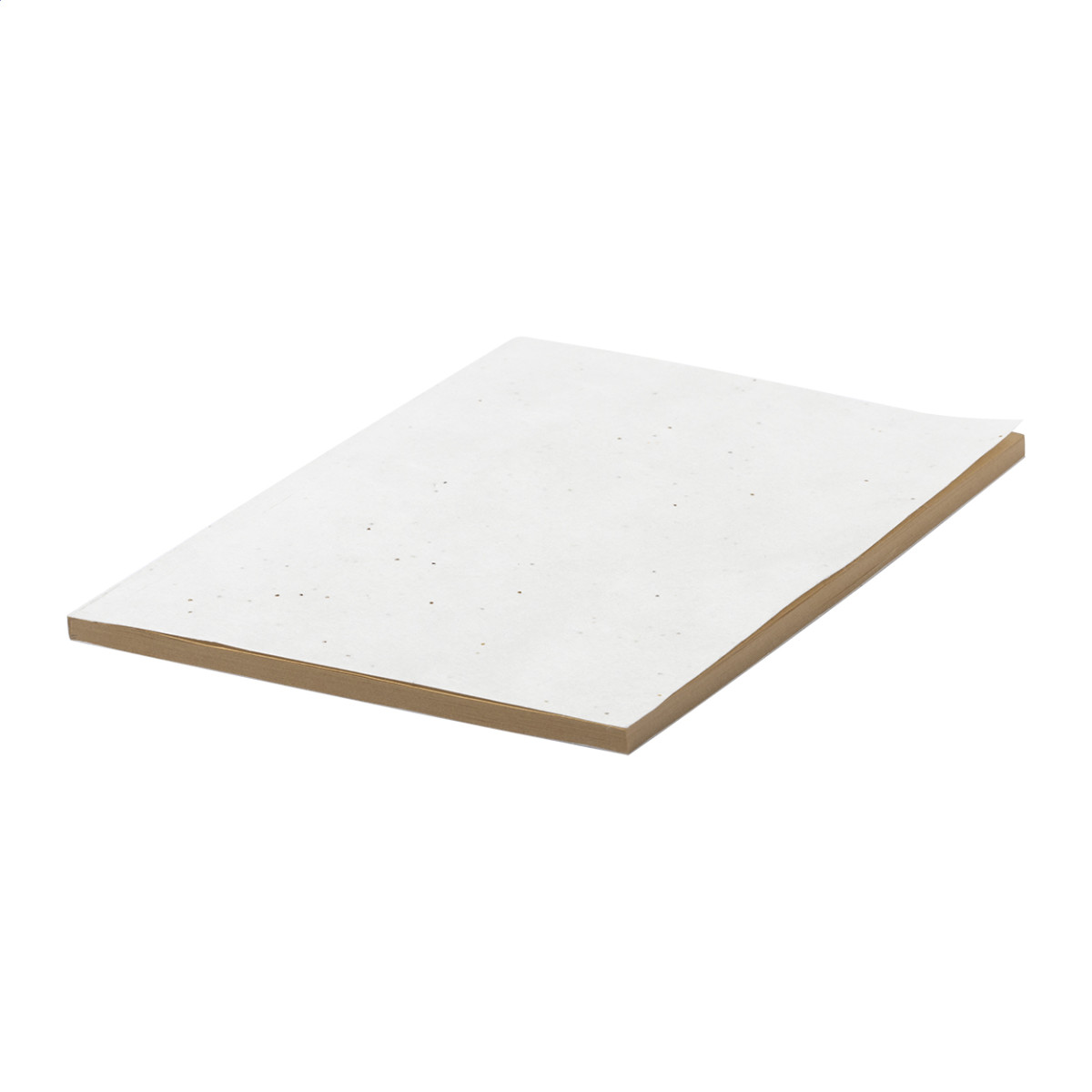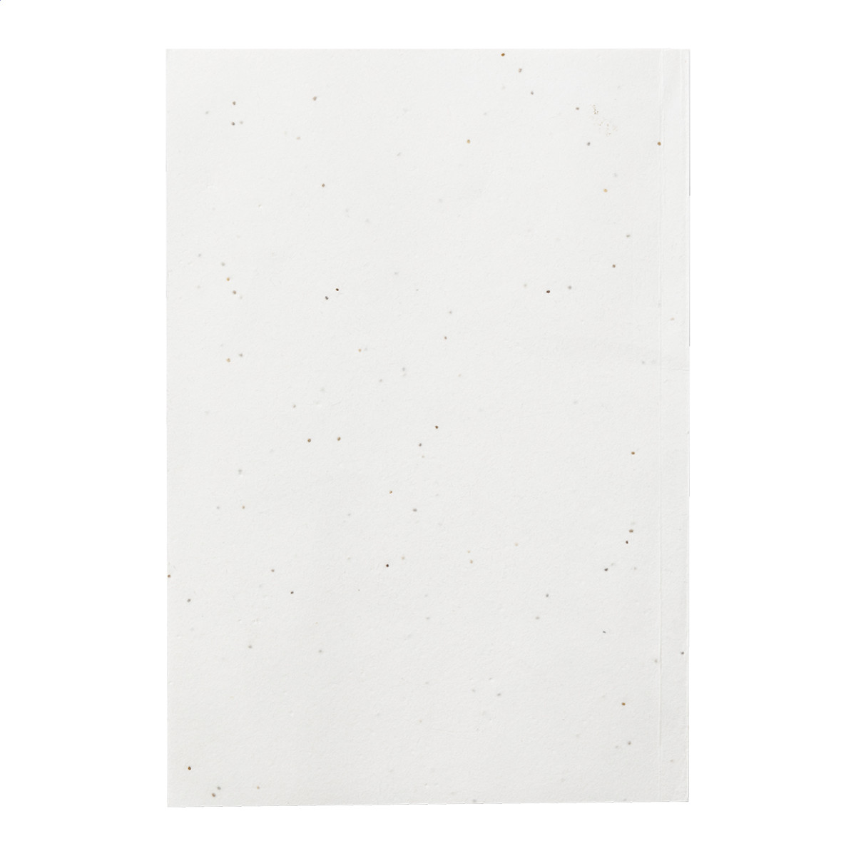 Újrahasznosított kraft papír jegyzetfüzet magpapír borítóval, 60 sima lappal. A magpapír borító különböző vadvirág magokat tartalmaz, melyeket a borító és a füzet szétválasztása után lehet elültetni. A5 méret. Eleje