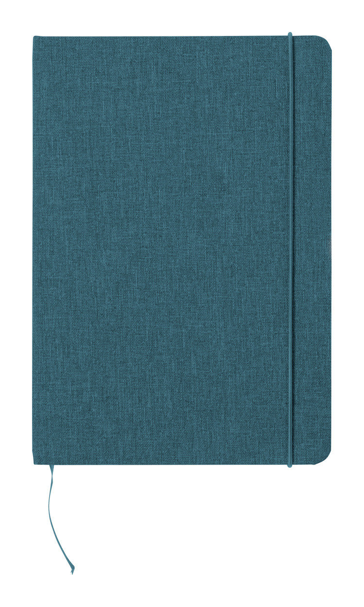 300D RPET poliészter borítású jegyzetfüzet 80 sima lappal. Hozzáillő színű gumipánttal, könyvjelzővel és tolltartóval. A5 méretű. Eleje