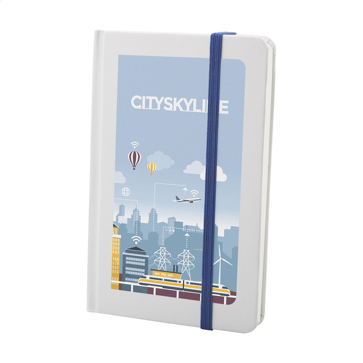 Fehér kartonpapír borítású jegyzetfüzet 80 sima lappal, színes gumipánttal zárható. A6 méretű. Eleje