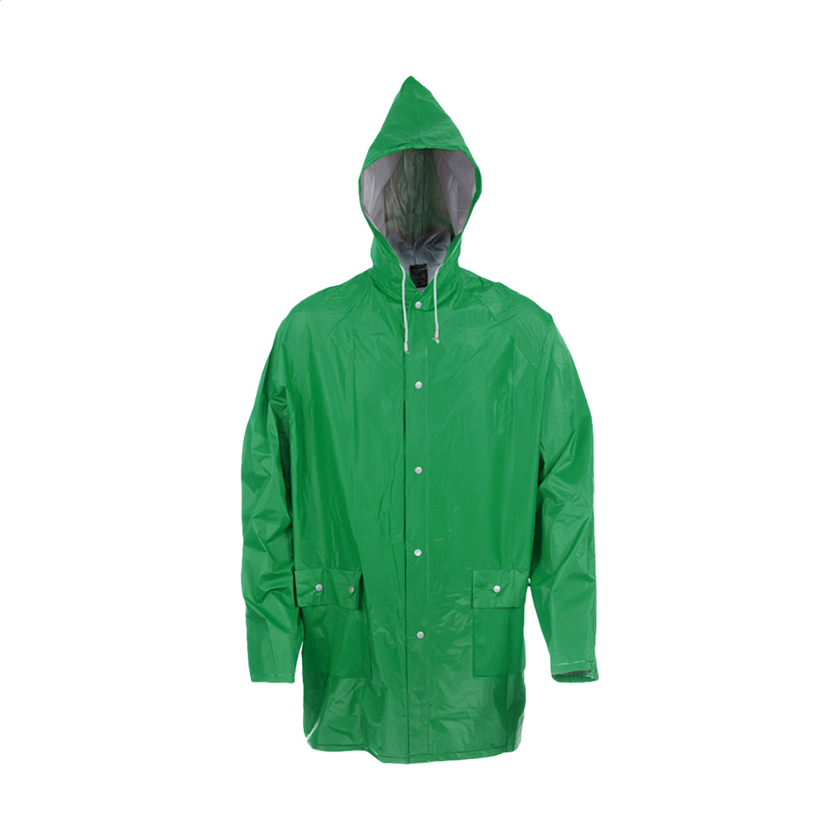 Kapucnis esőkabát ellenálló PVC anyagból, hőtartó bevonattal és két első zsebbel. Patenttal zárható. Bal mellkas