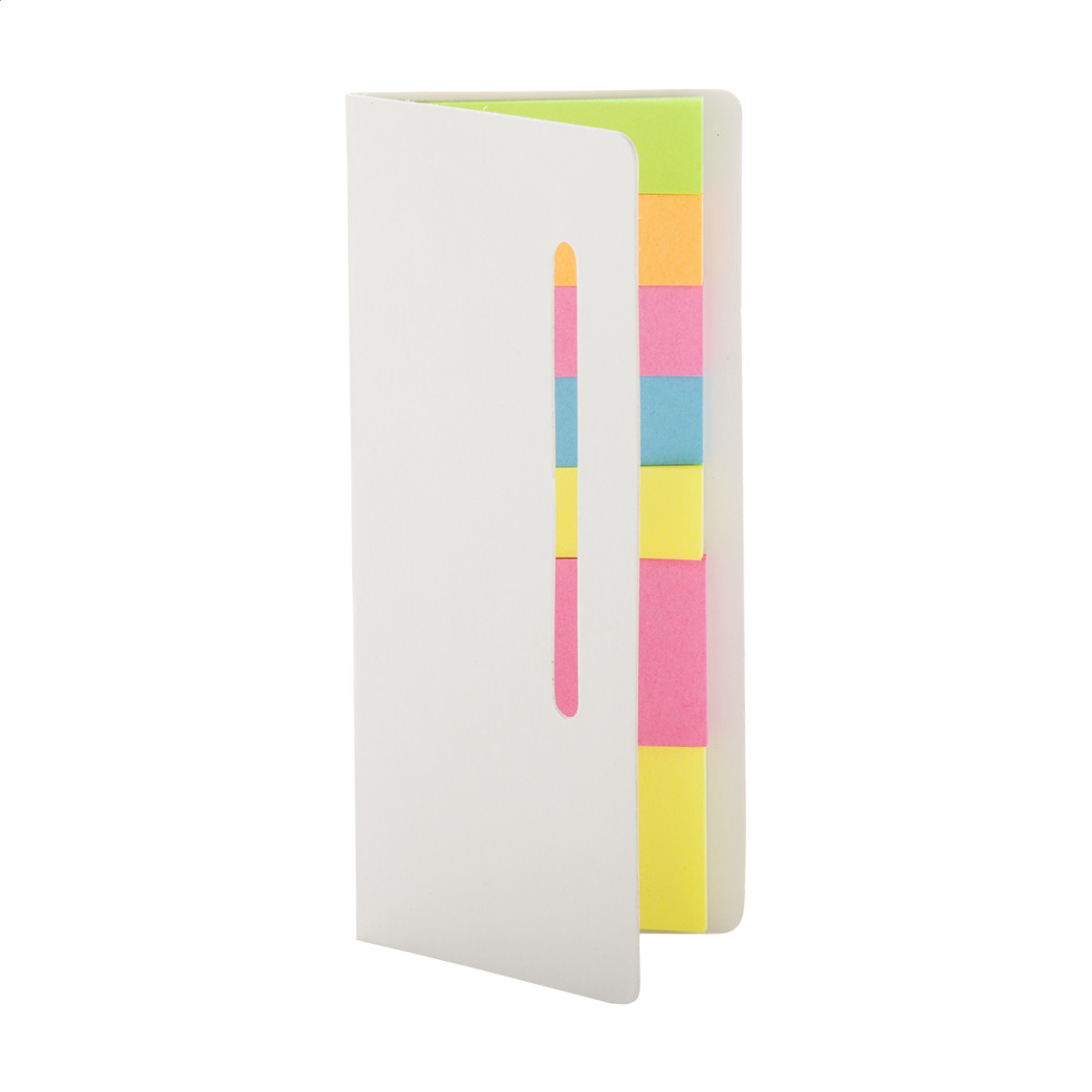 Különböző méretű öntapadós jegyzetlapok (2×20 db közepes és 5×20 kicsi), papír tokban.