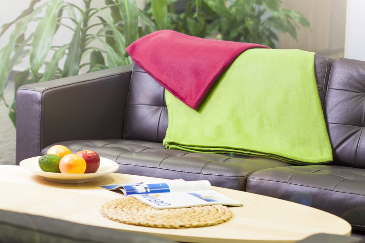 Polár takaró, tépőzáras hordozó pánttal. Anyaga: 100% poliészter, 200 g/m². Pánt