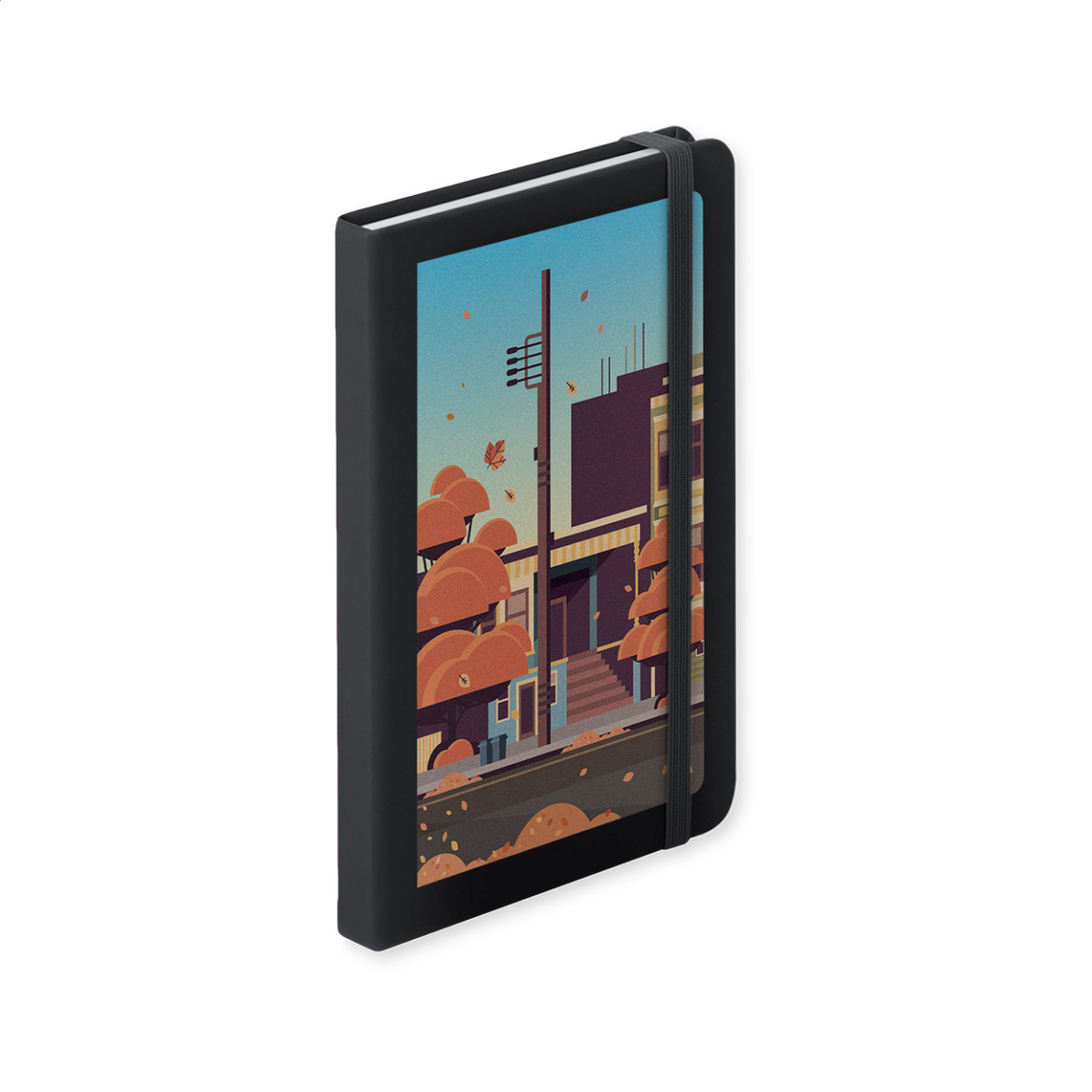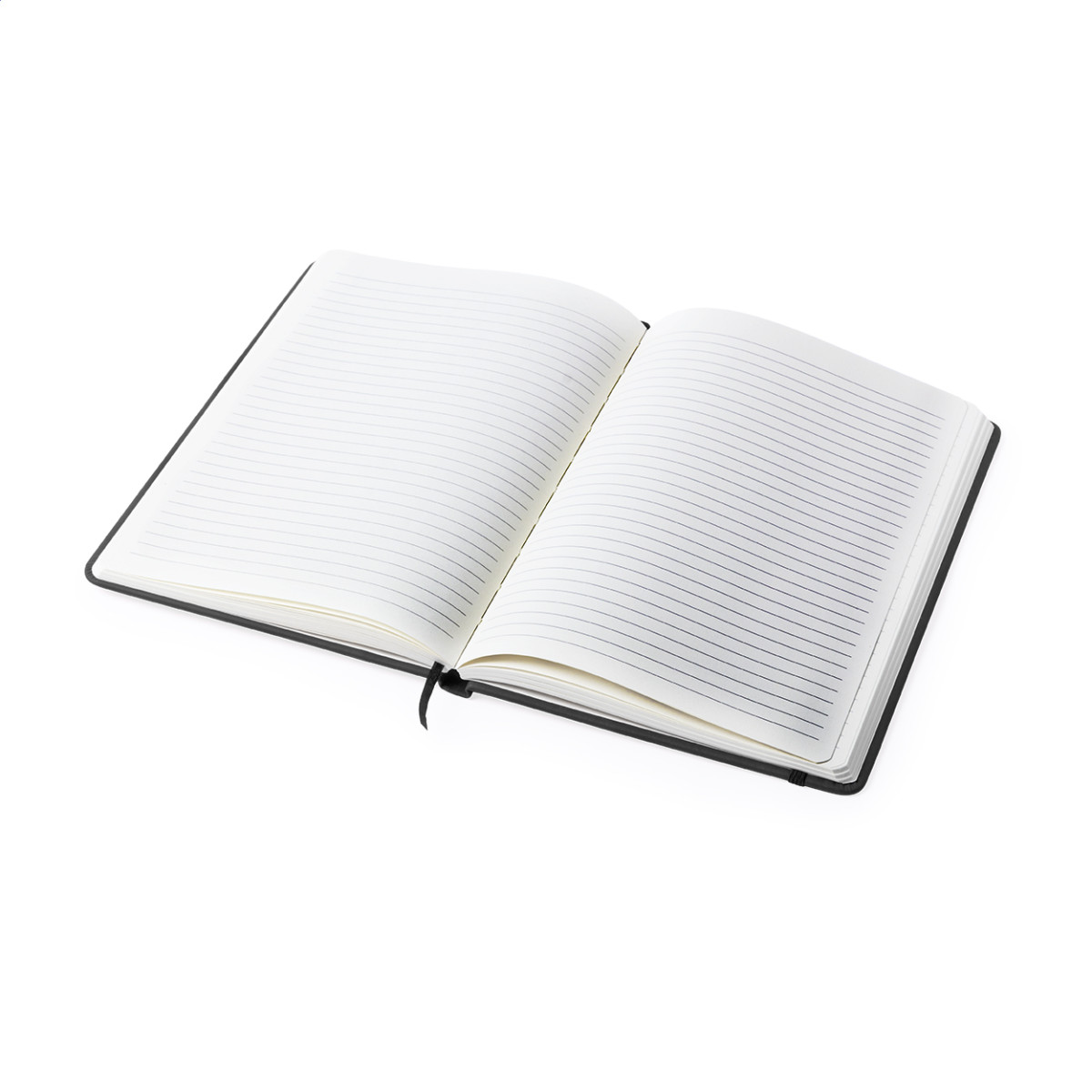 PU bőr borítású jegyzetfüzet 100 vonalas lappal, könyvjelzővel, gumipánttal zárható. Eleje