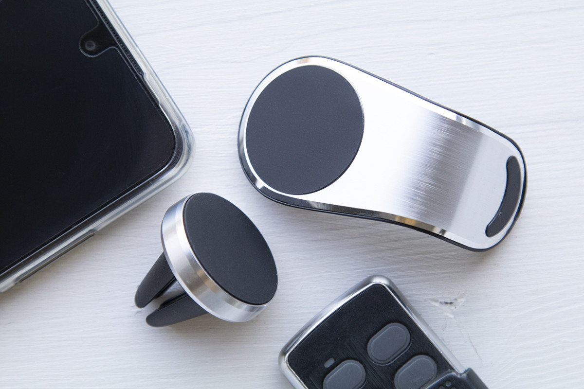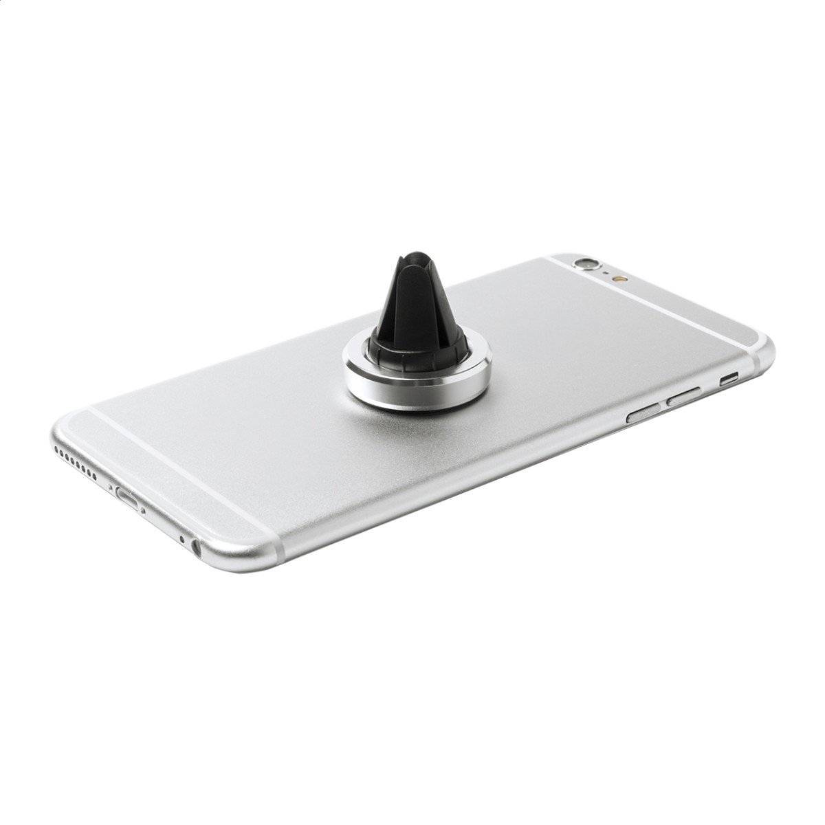 Mágneses alumínium autós mobiltartó, szellőzőre rögzíthető. Öntapadó fémlemezzel együtt, ajándékdobozban szállítjuk. Fém betét