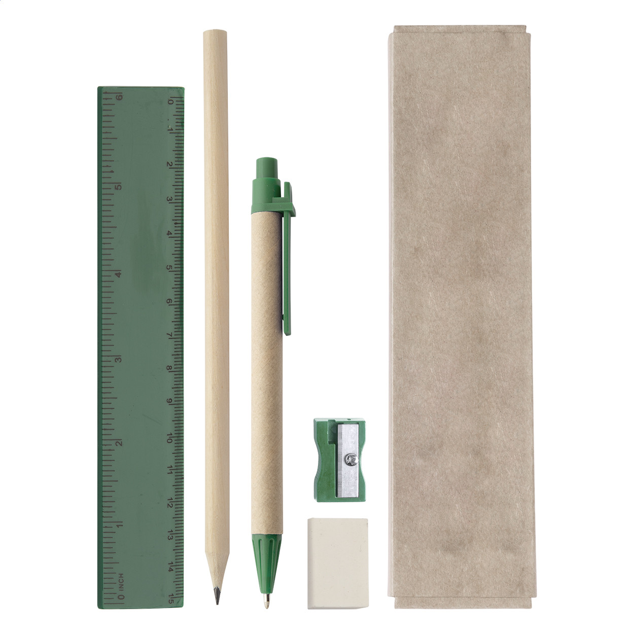 5 darabos írószerkészlet kartondobozban. Tartalma: újrahasznosított papírból készült golyóstoll, grafitceruza, vonalzó, hegyező és radír. Kék tollbetéttel szállítjuk. Doboz