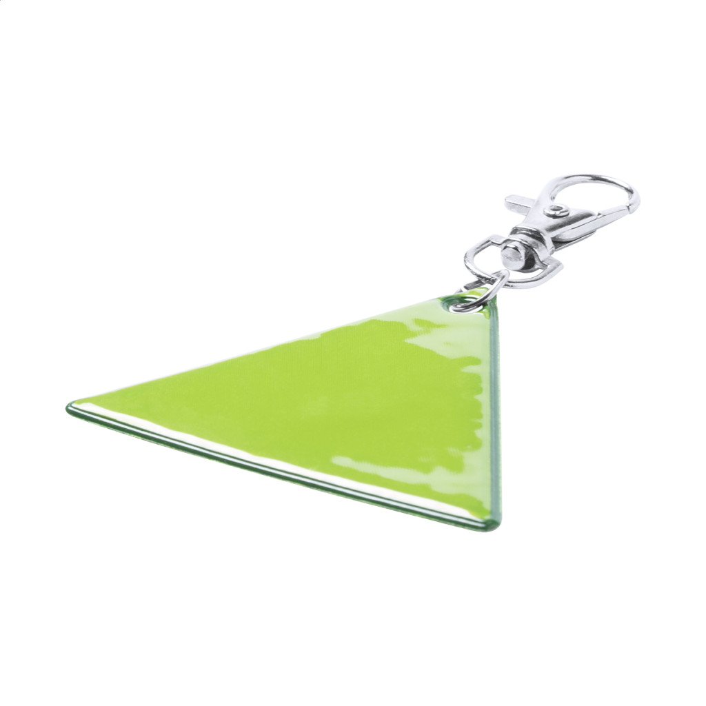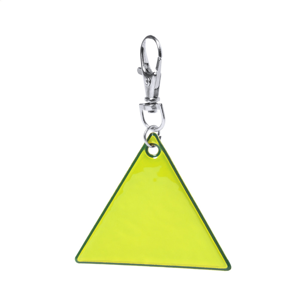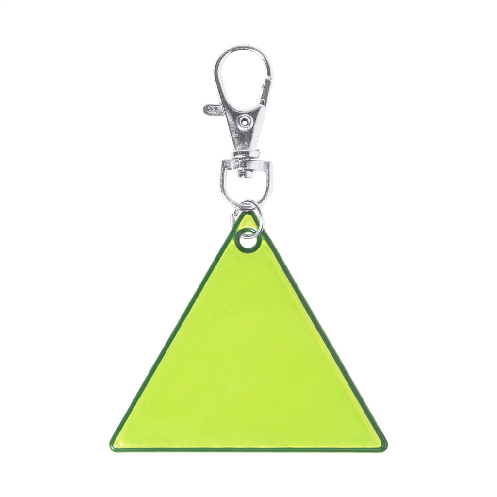 Háromszög alakú fényvisszaverő kulcstartó karabinerrel, PVC. A termék kizárólag promóciós célra alkalmas, nem minősül egyéni védőfelszerelésnek. Eleje