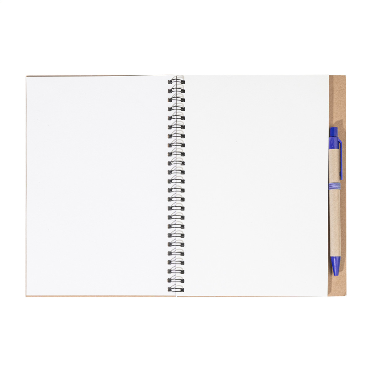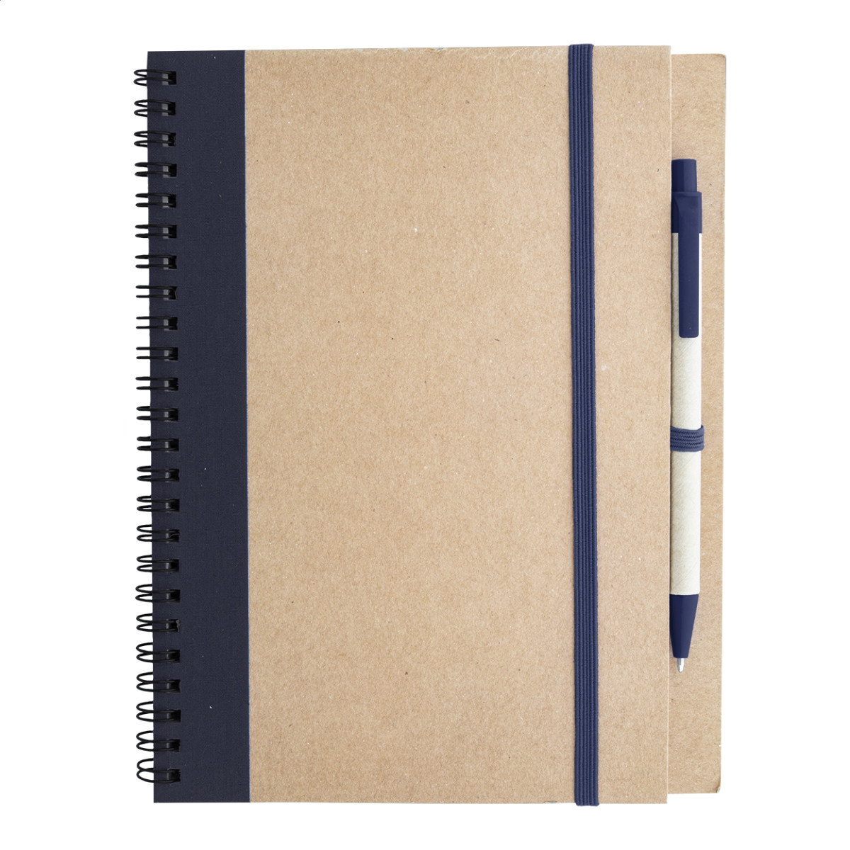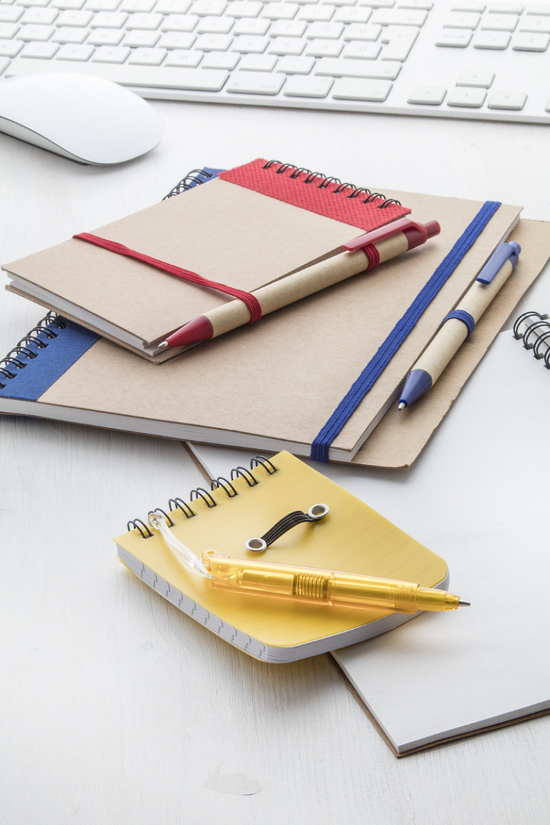 Újrahasznosított papírból készült spirálozott jegyzetfüzet 60 sima lappal, papír golyóstollal. Eleje