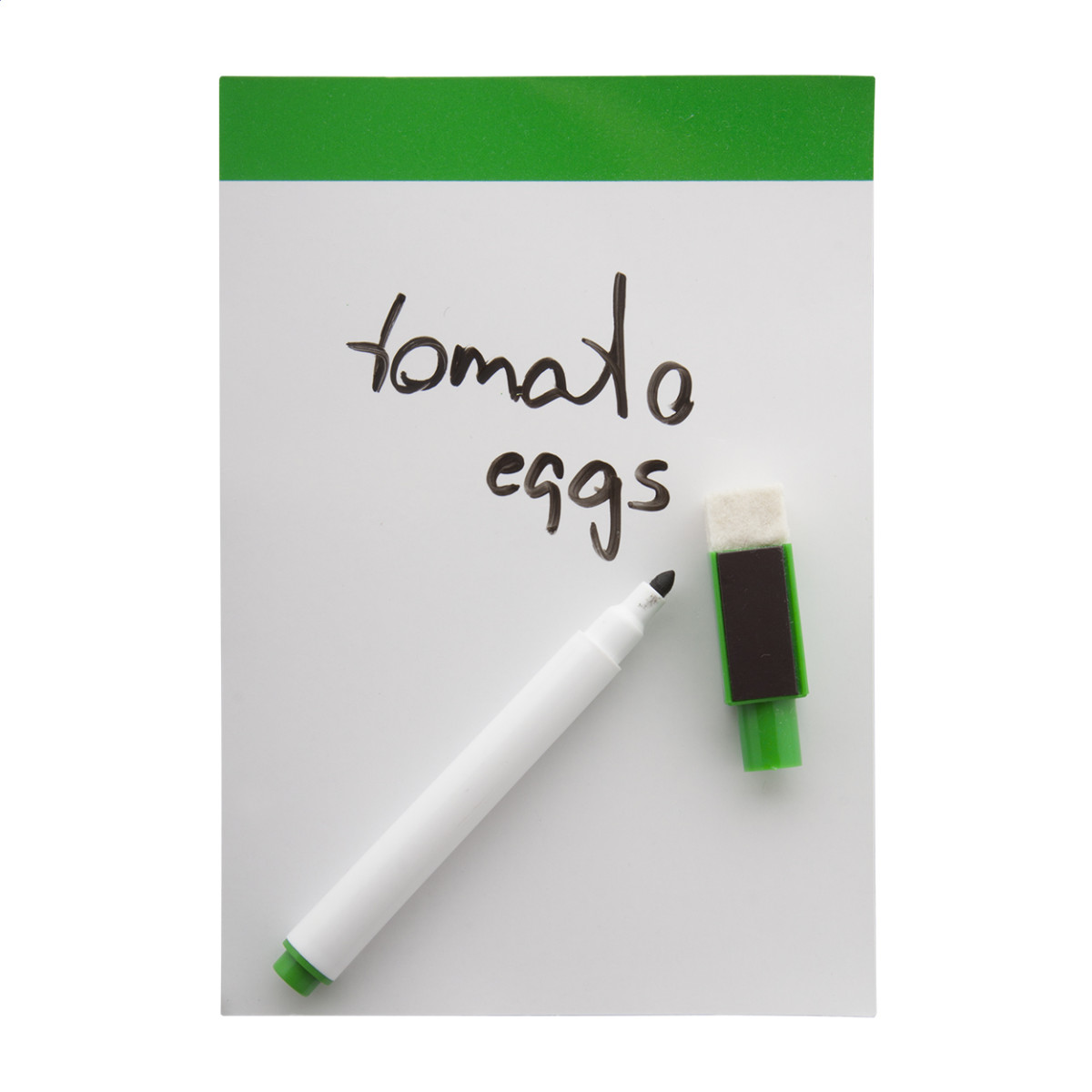 Mágneses üzenőtábla, mágneses filctollal és törlővel.