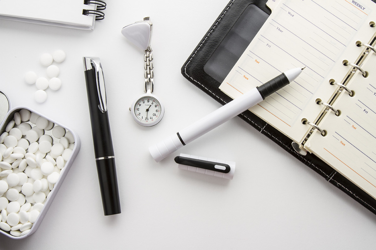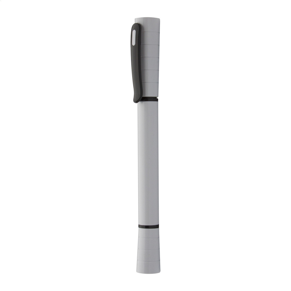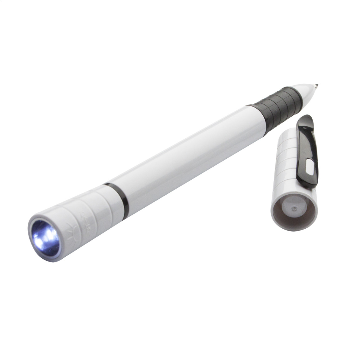 Műanyag golyóstoll, végében LED lámpával. Kék tollbetéttel és gombelemmel szállítjuk. Test - jobbkezes