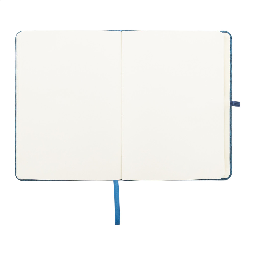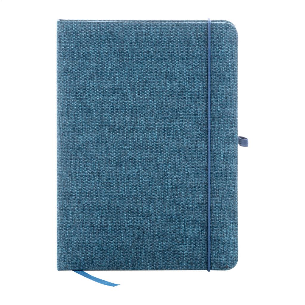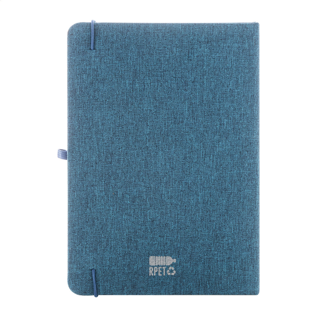 300D RPET poliészter borítású jegyzetfüzet 80 sima lappal. Hozzáillő színű gumipánttal, könyvjelzővel és tolltartóval. A5 méretű. Eleje