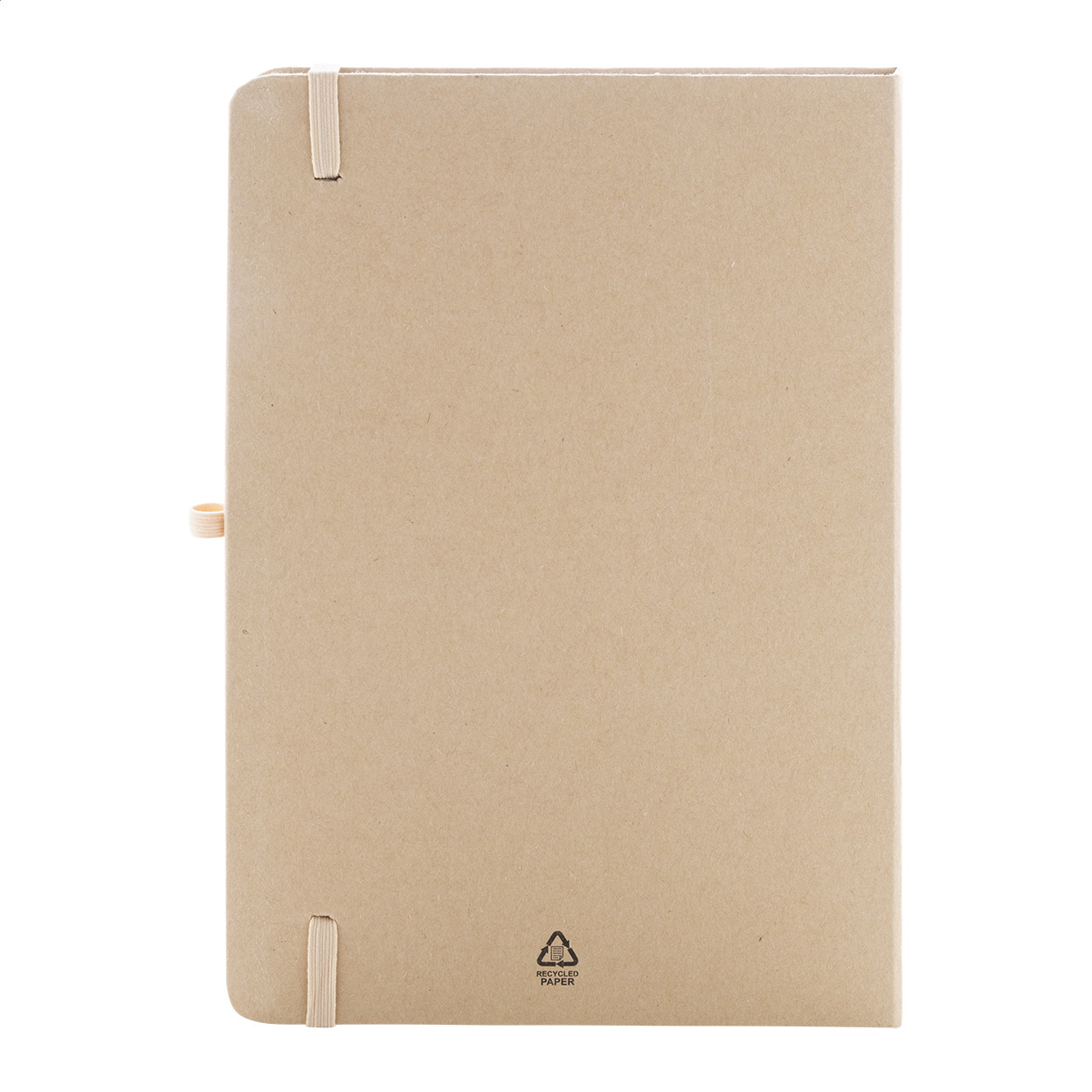 Újrahasznosított kartonból készült jegyzetfüzet 70 sima lappal. A belső borító 25 öntapadós jegyzetpapírt, 125 oldaljelölőt és egy kártyatartó zsebet tartalmaz. Gumipánttal és tolltartóval. A5 méret. Eleje