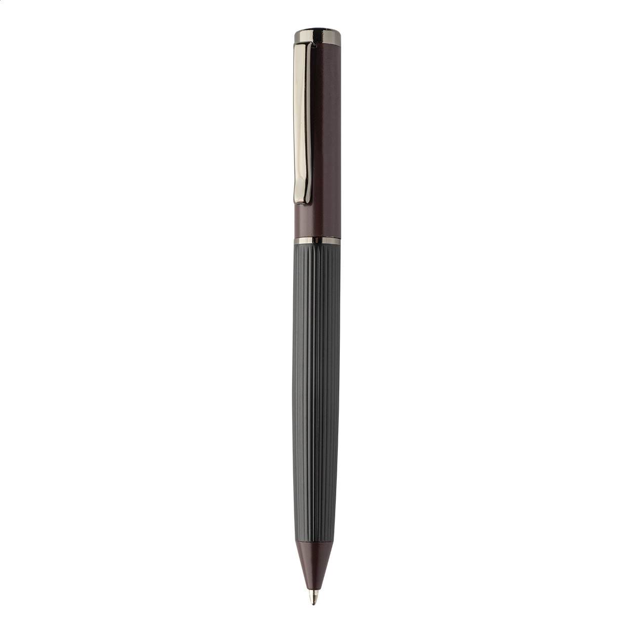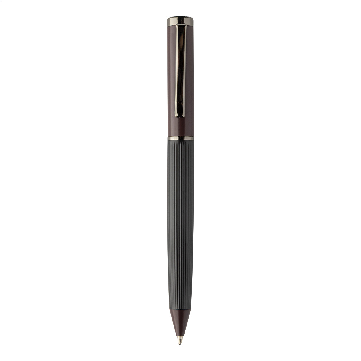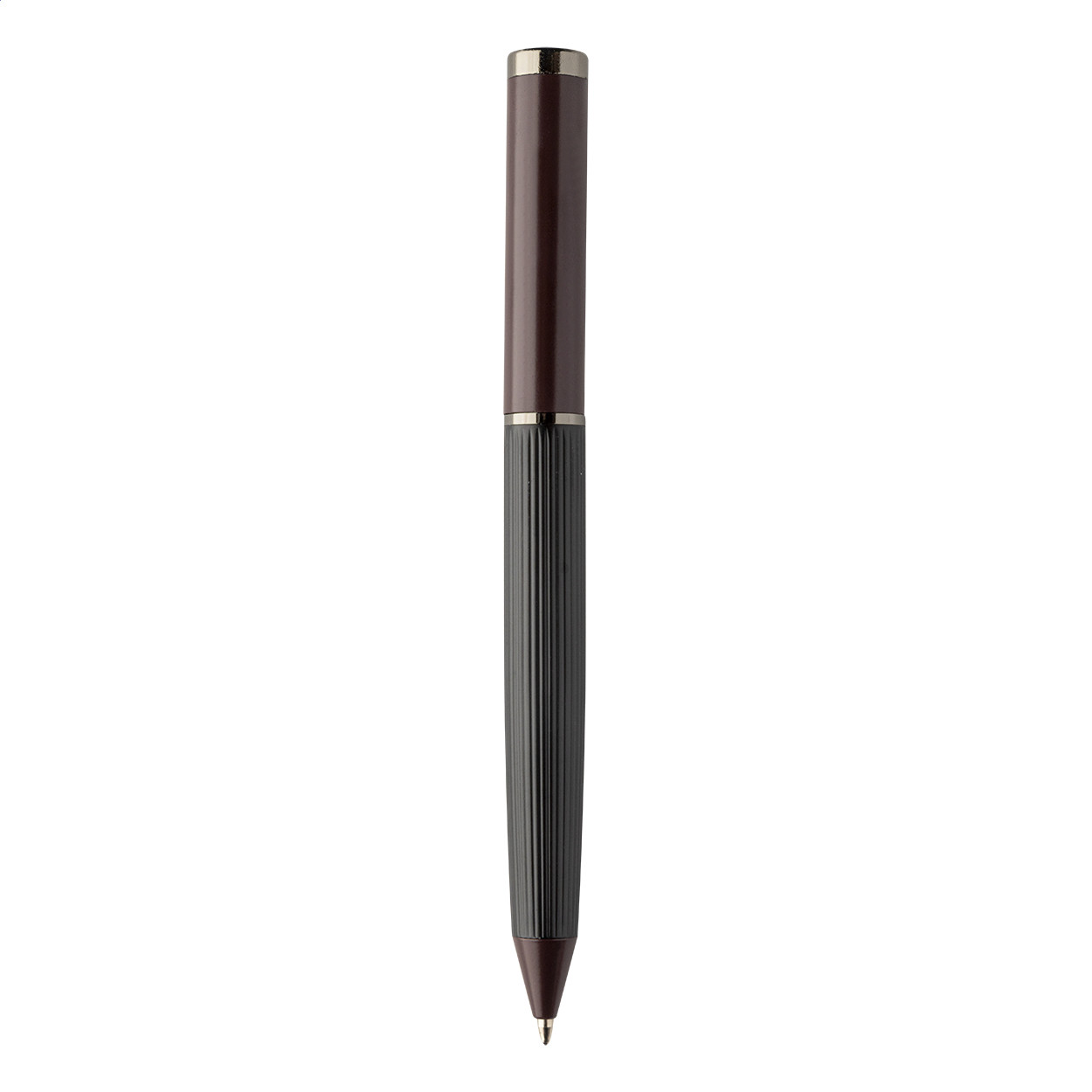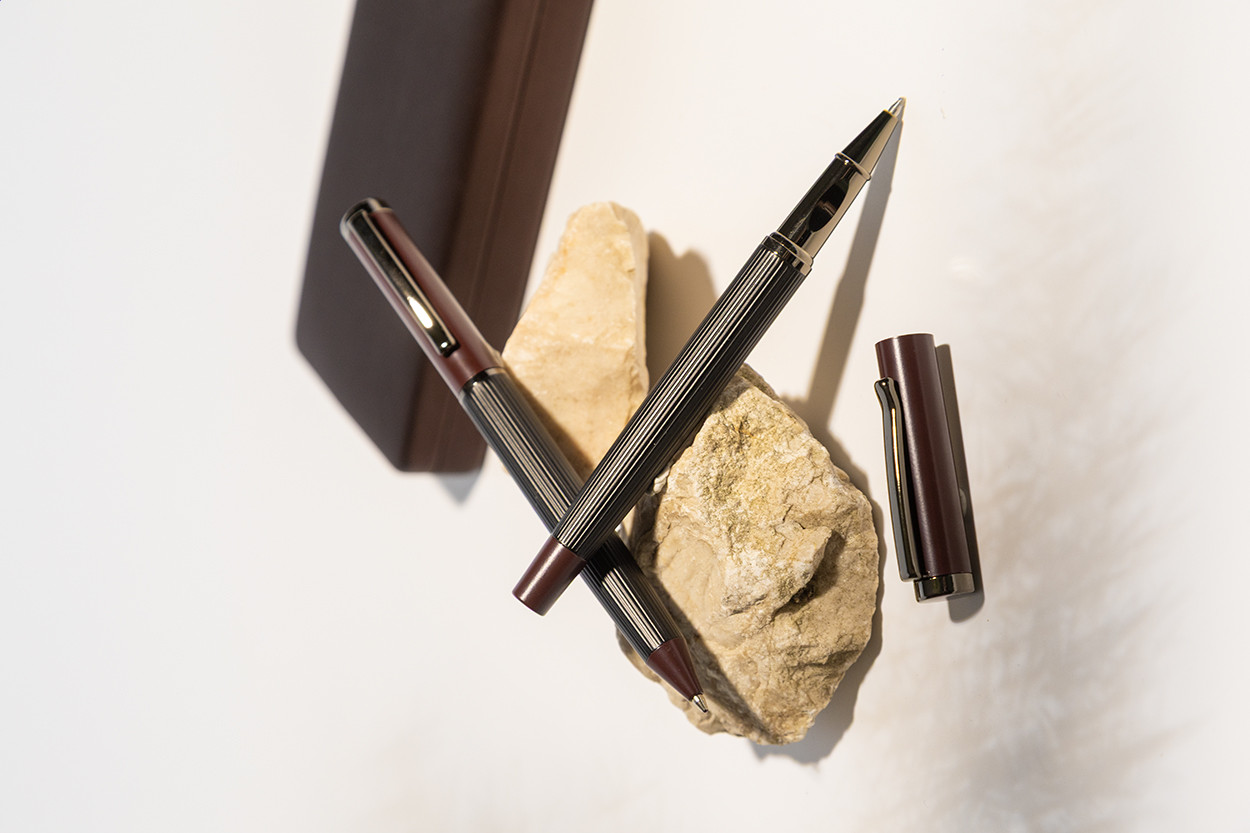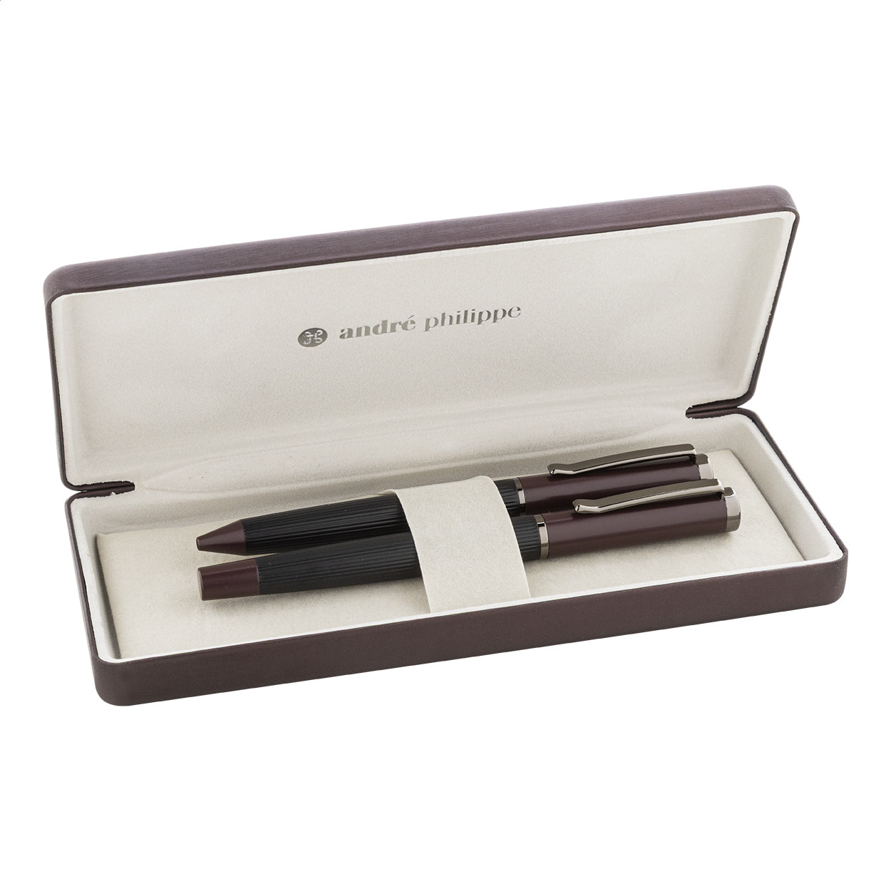 Elegáns, fém golyóstoll és rollertoll szett csíkos testtel, színes díszítőelemekkel és fényes fegyverfém részletekkel. Színben hozzáillő ajándékdobozban, kék tollbetéttel. André Philippe márkatermék. Golyóstoll klipsz alatt - jobbkezes
