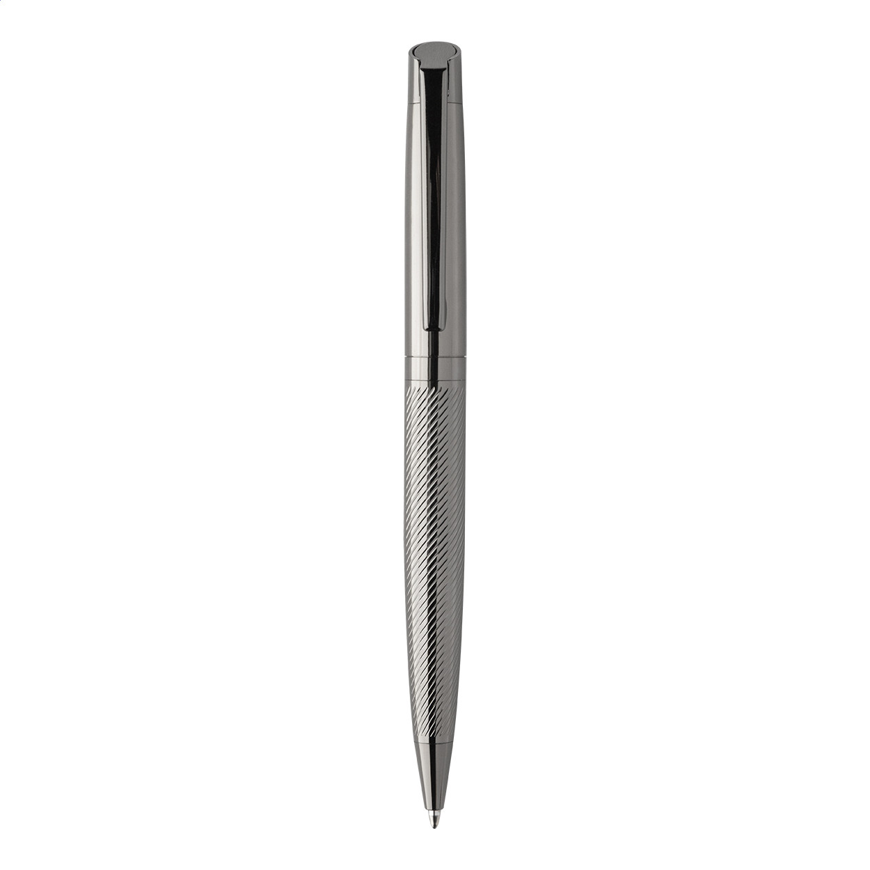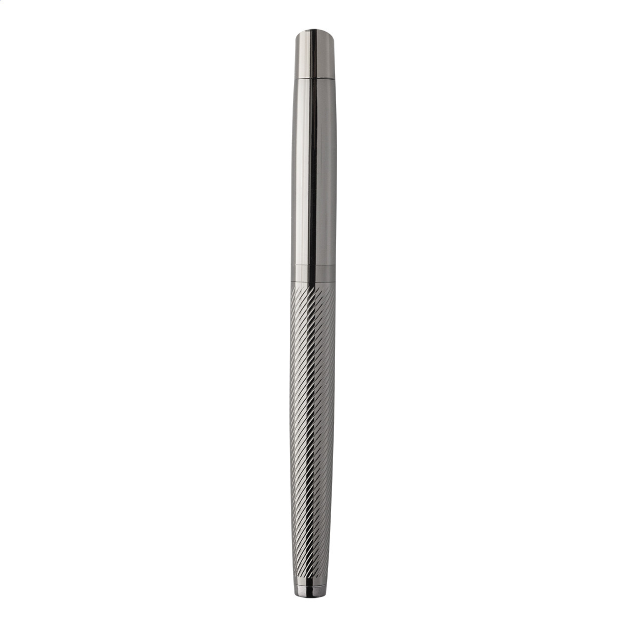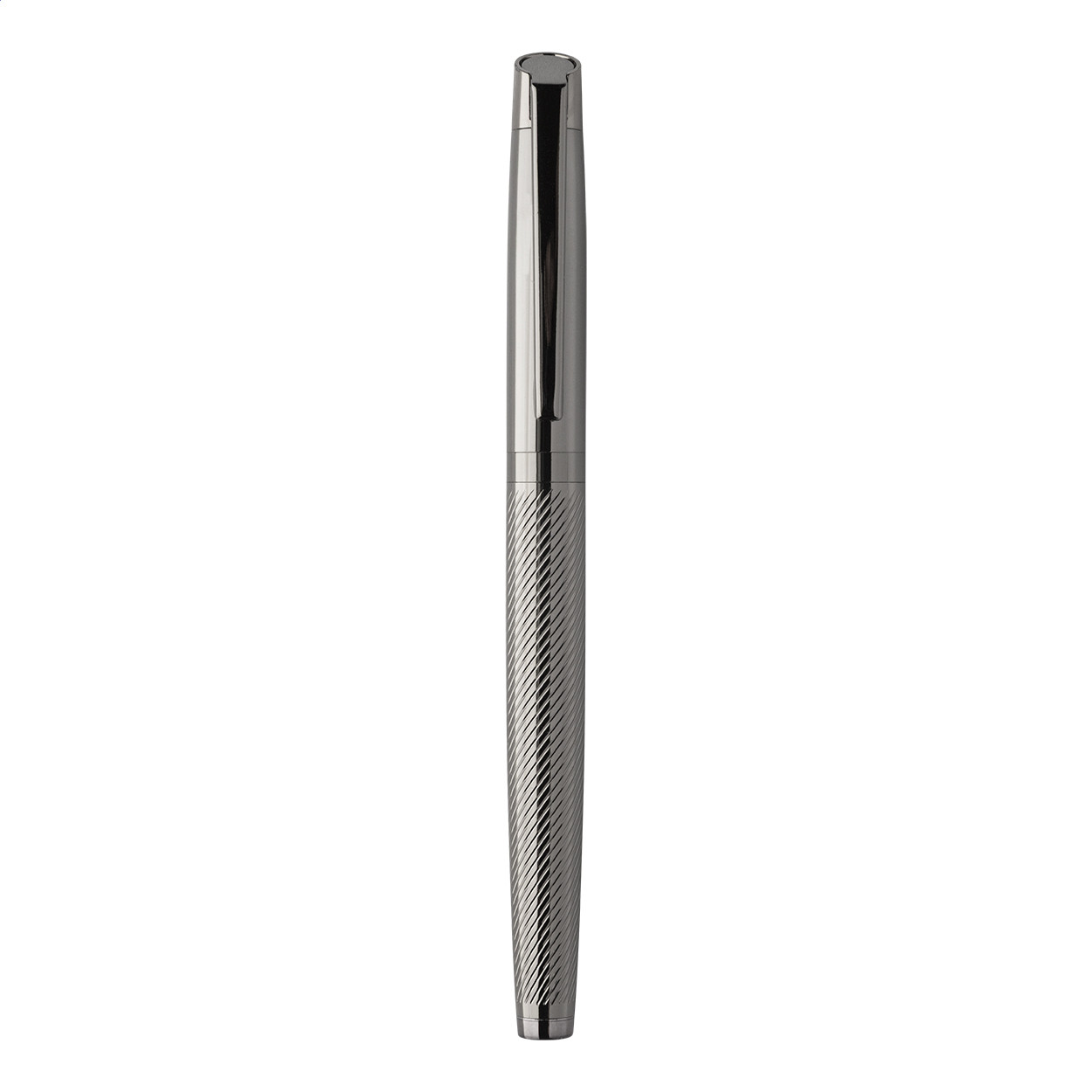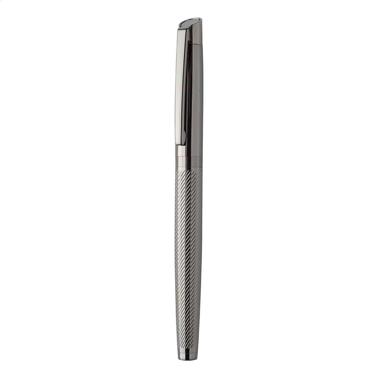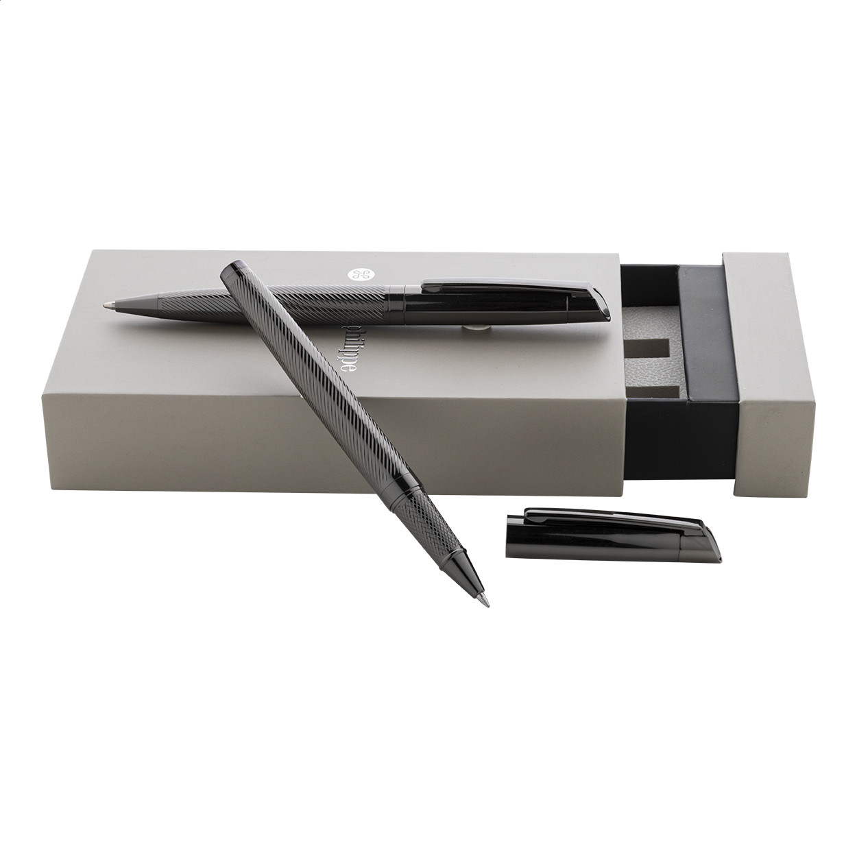 Elegáns, fém golyóstoll és rollertoll szett átlósan texturált testekkel. Kéttónusú ajándékdobozban, kék tollbetéttel. André Philippe márkatermék. Golyóstoll klipsz alatt - jobbkezes