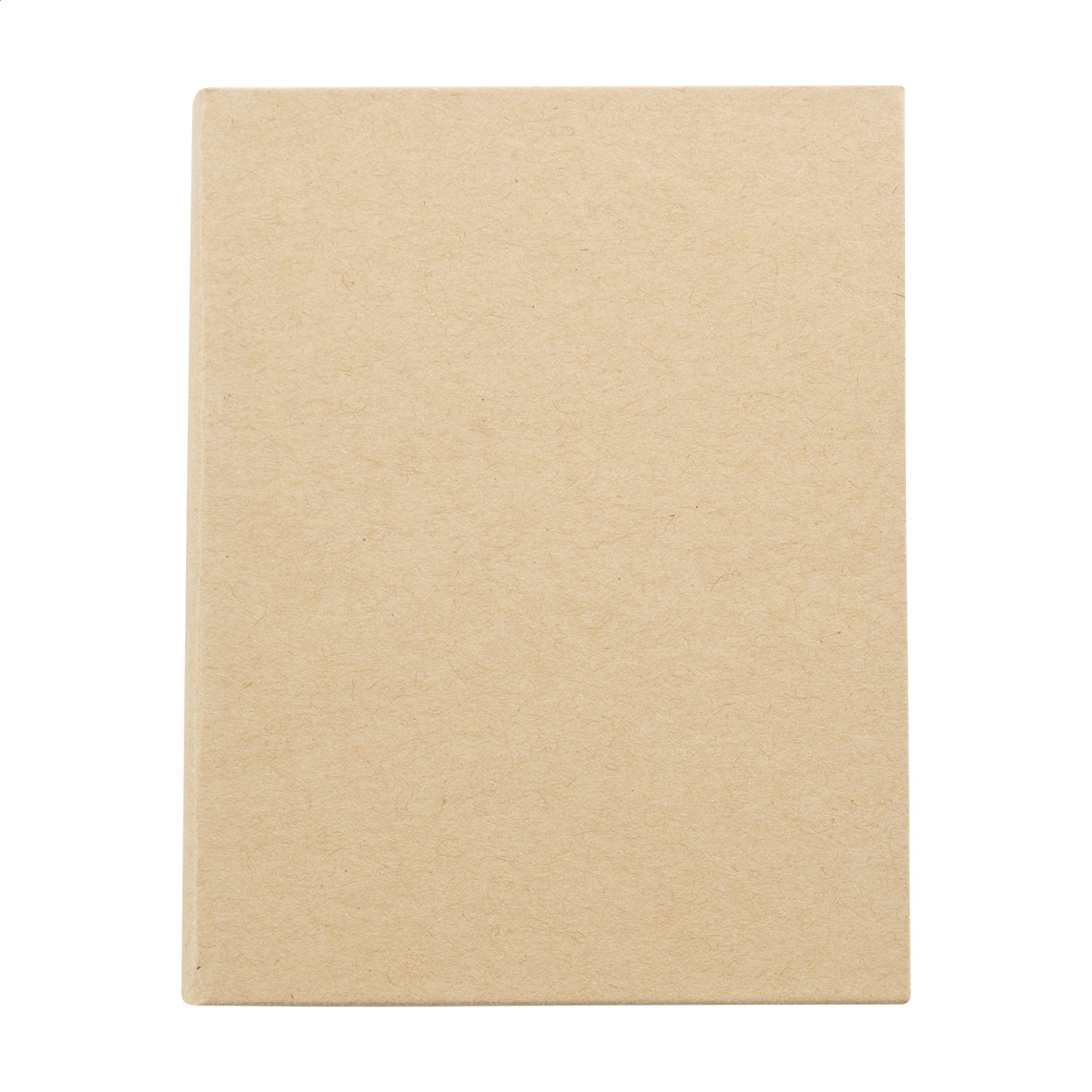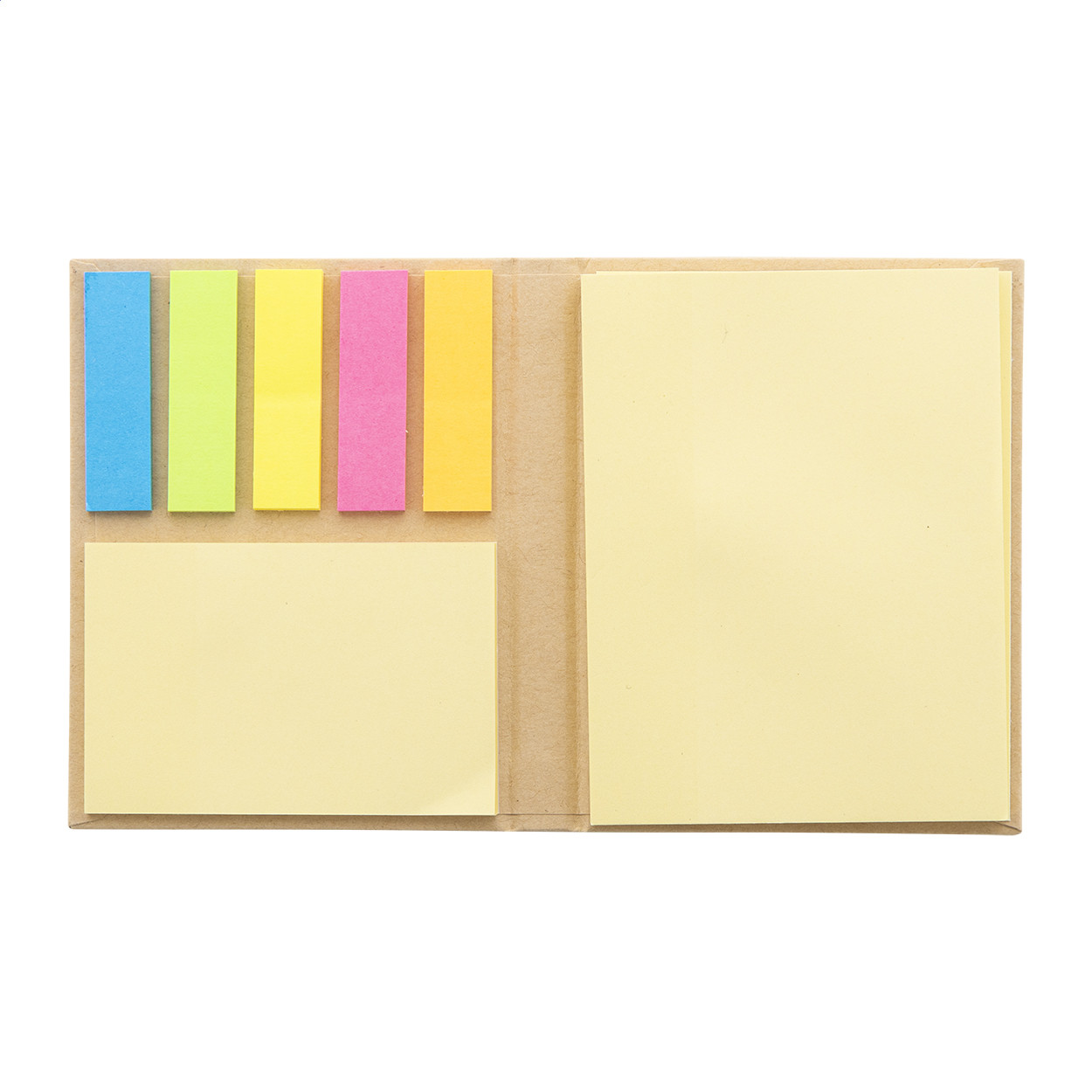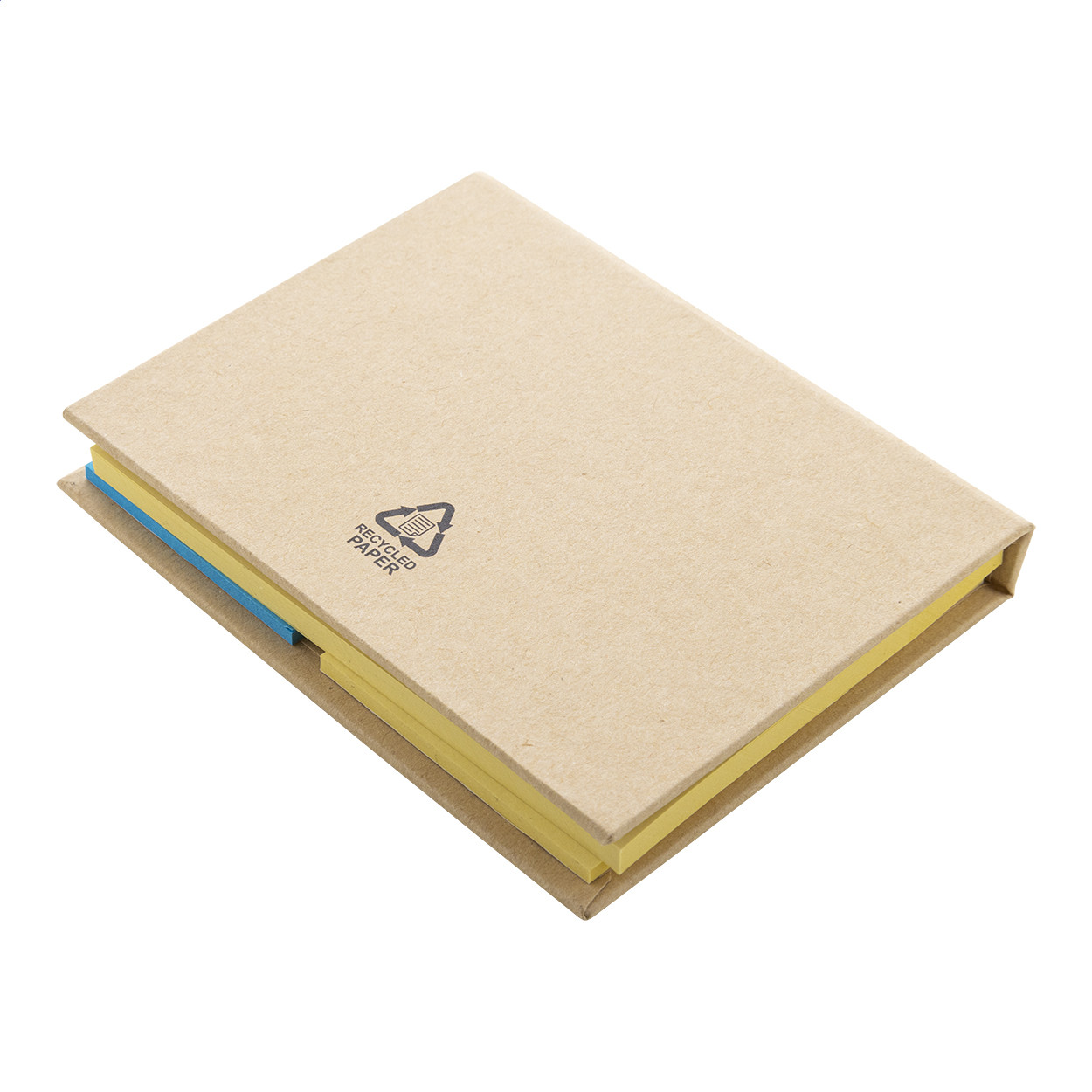 Újrahasznosított papírból készült öntapadós jegyzettömb 50 nagy és 25 közepes sárga jegyzetlappal, 125 oldaljelölővel (5 színben).