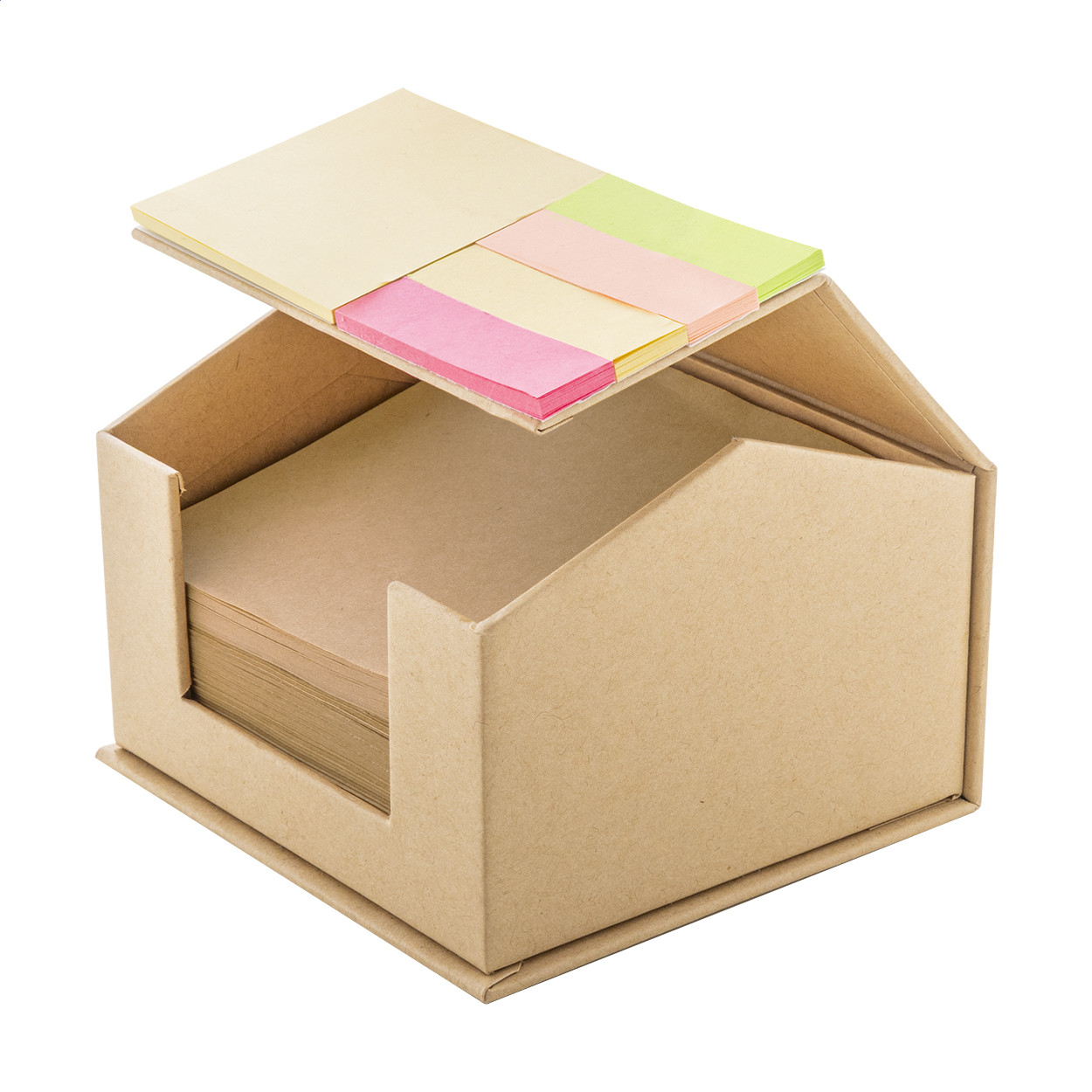 Ház alakú, újrahasznosított kartonból készült jegyzetadagoló 300 lapos újrahasznosított kraft papír jegyzetlappal. 25 sárga öntapadós jegyzetlapot és 100 oldaljelölőt (4 színben) tartalmaz a tetején. |