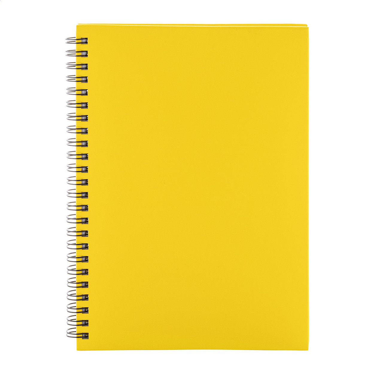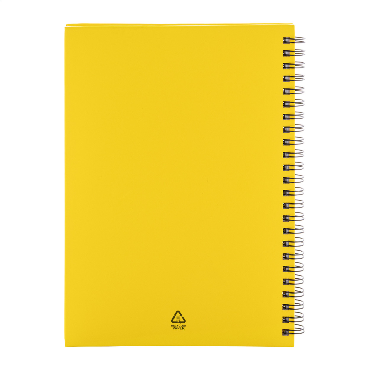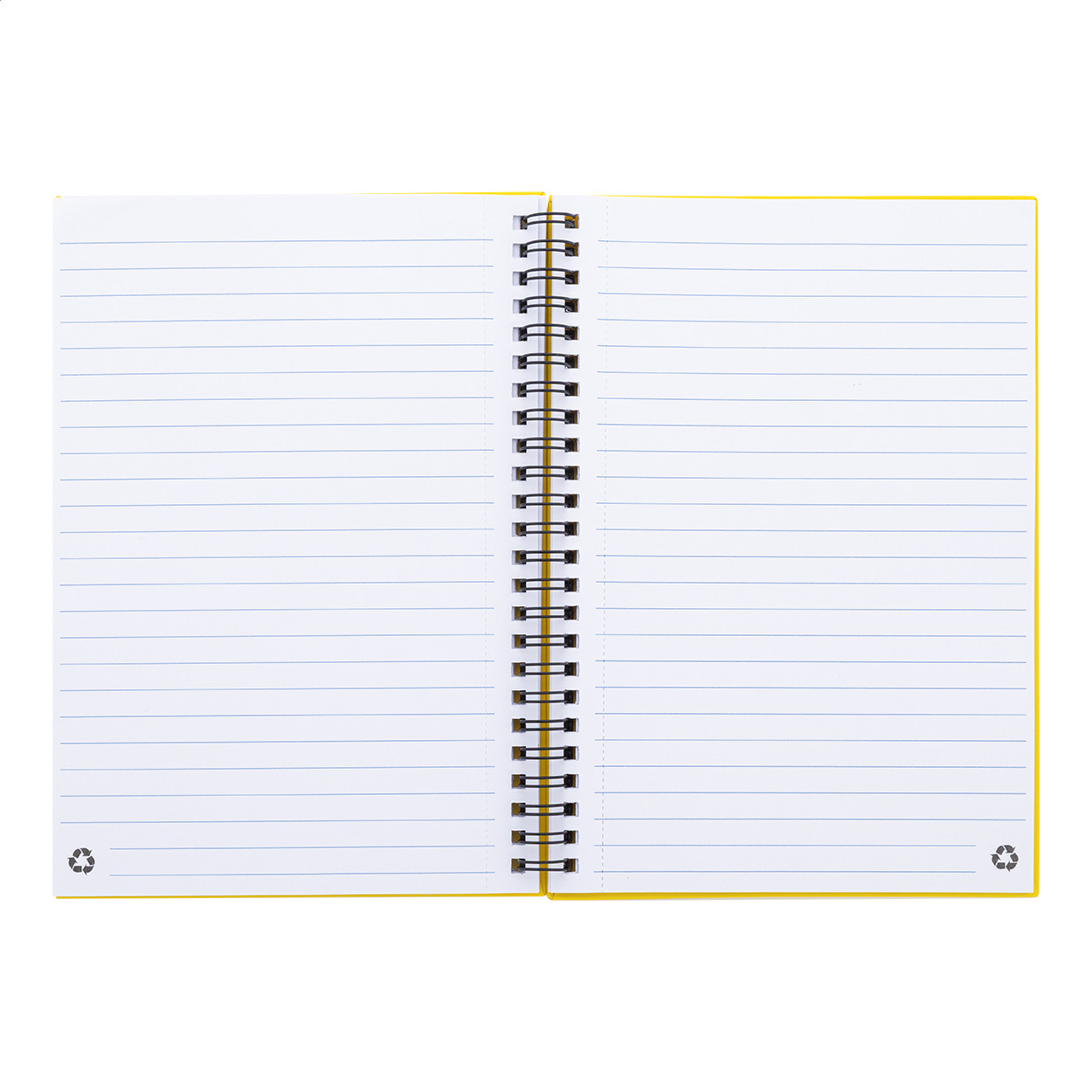 Újrahasznosított papír borítású spirál jegyzetfüzet 80 vonalas lappal, A5 méretű. Eleje