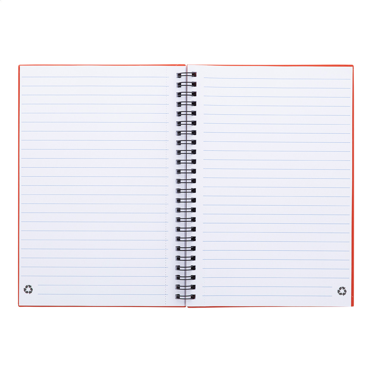 Újrahasznosított papír borítású spirál jegyzetfüzet 80 vonalas lappal, A5 méretű. Eleje