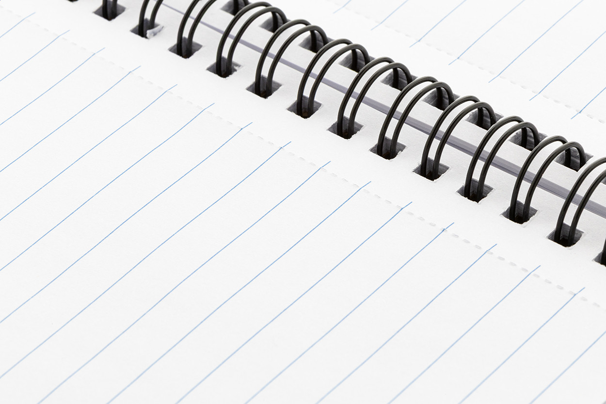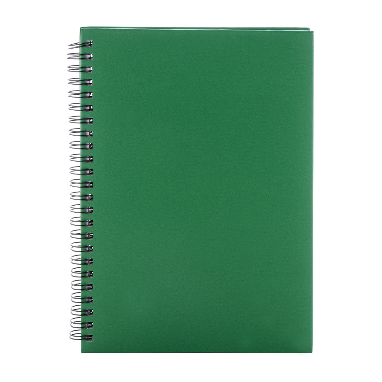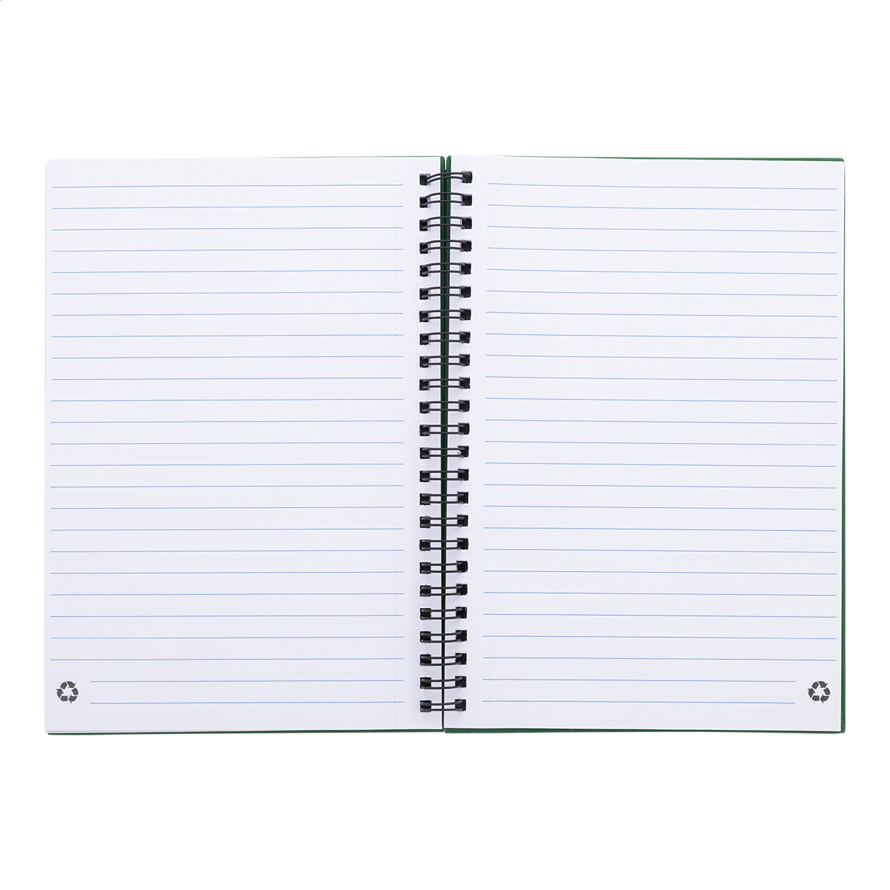 Újrahasznosított papír borítású spirál jegyzetfüzet 80 vonalas lappal, A5 méretű. Eleje