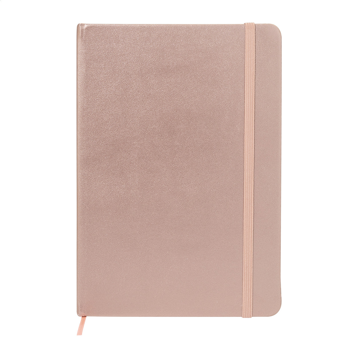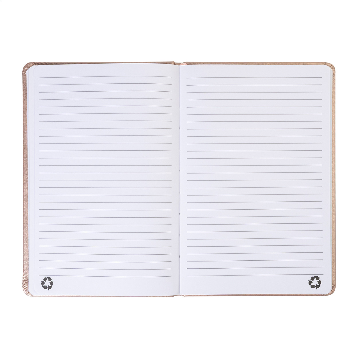 Fémes felületű, újrahasznosított PU műbőrrel borított jegyzetfüzet 100 vonalas lappal, újrahasznosított papírból. Színben megegyező könyvjelzővel és gumiszalaggal. A5-ös méret. Eleje