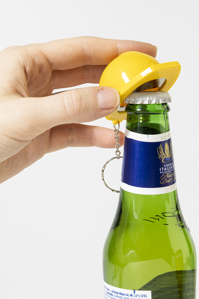 Újrahasznosított ABS műanyagból készült, sisak alakú kulcstartó üvegnyitóval. Jobb oldal