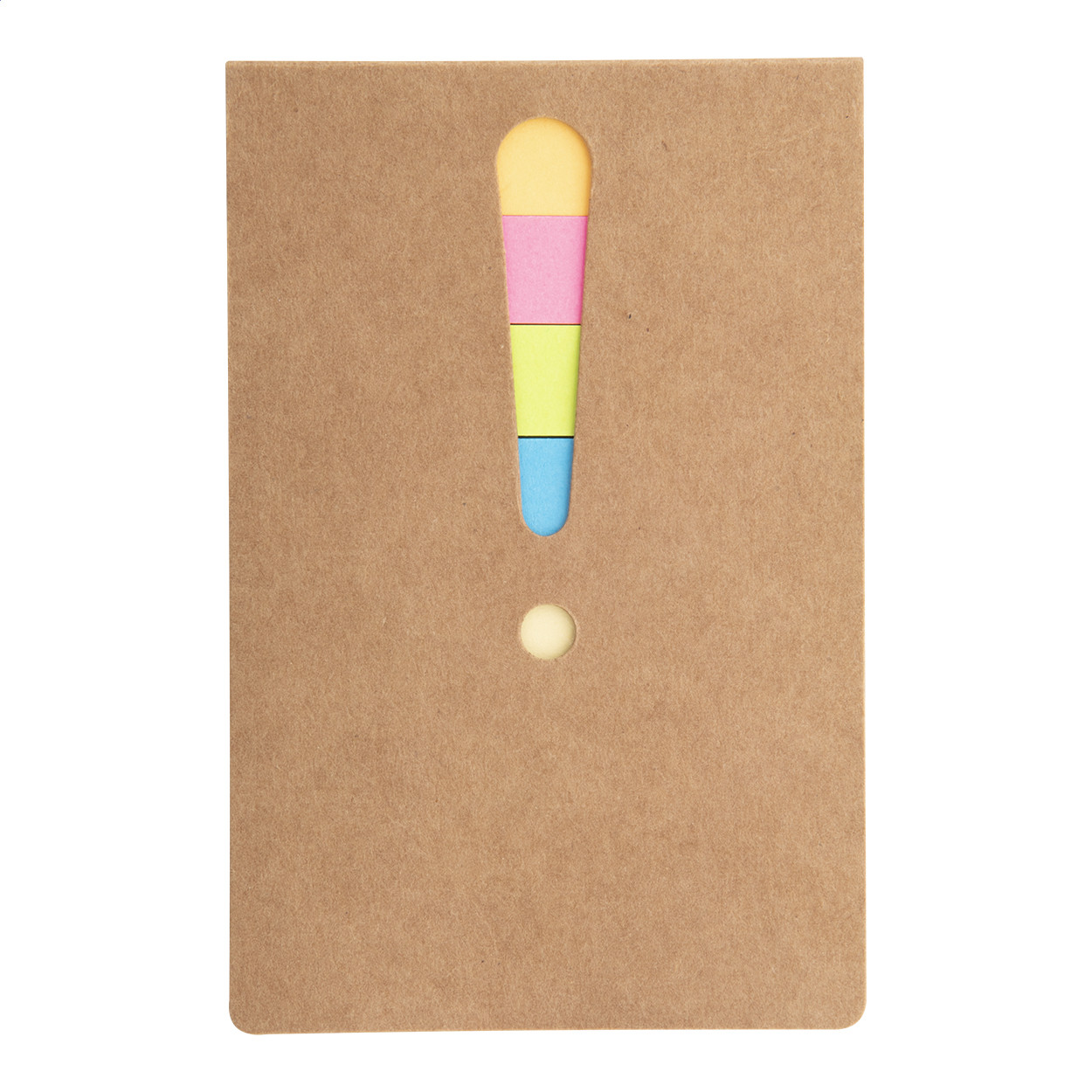 Öntapadós jegyzettömb 25 db nagy és 100 db kisebb lappal, 4 különböző színben. Kivágott fekiáltójellel a borítón. Eleje - teteje