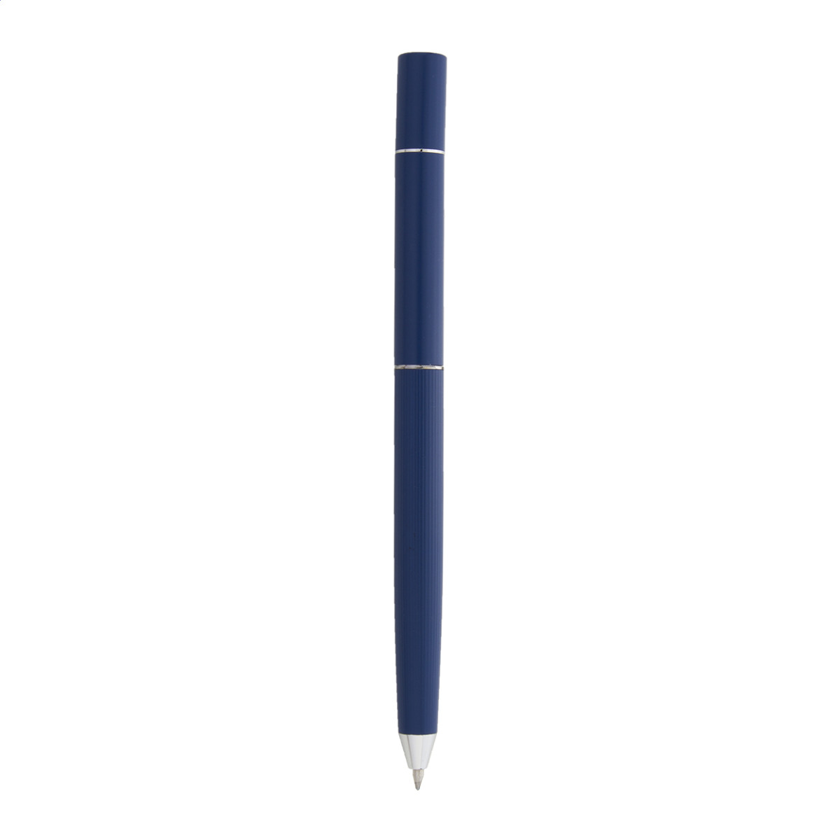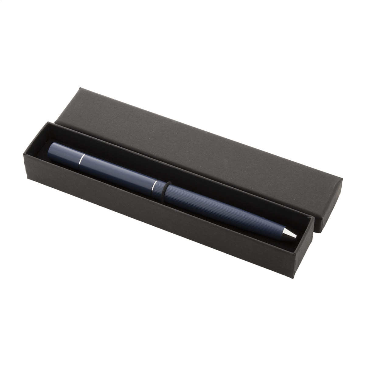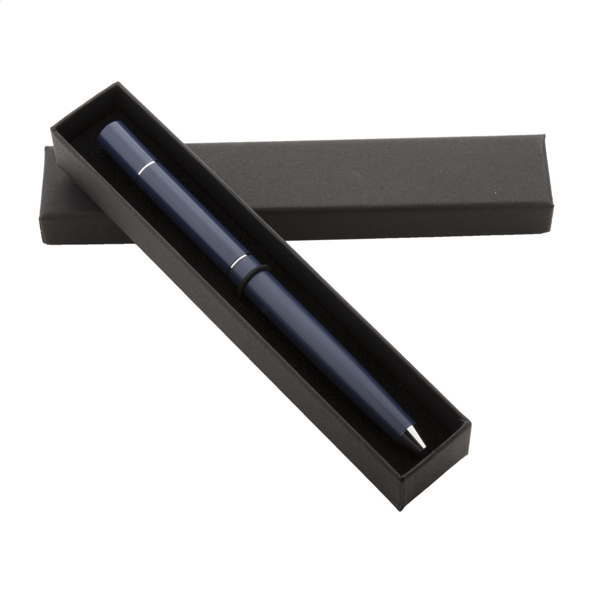 Többfunkciós fém toll. Egyik oldalán tekerős golyóstollal, kék tollbetéttel, másik oldalán tintamentes tollal és fémötvözet heggyel, amely oxidálja a papírt. Ez a toll a ceruzához hasonlóan ír, és radírozható is. Fekete díszdobozban szállítjuk. Test - jobbkezes (fent)