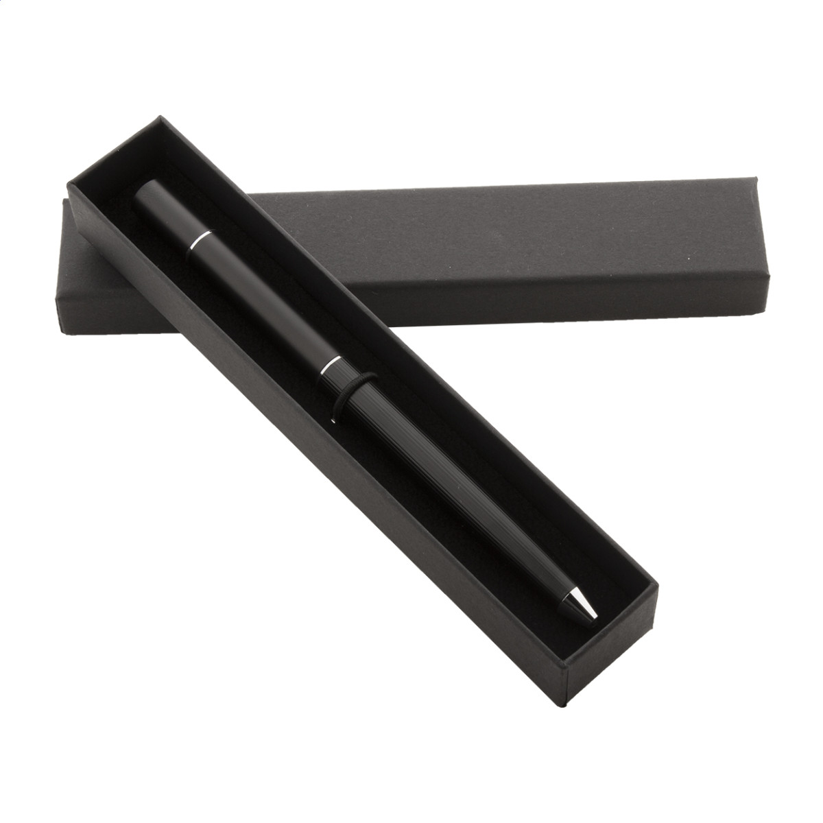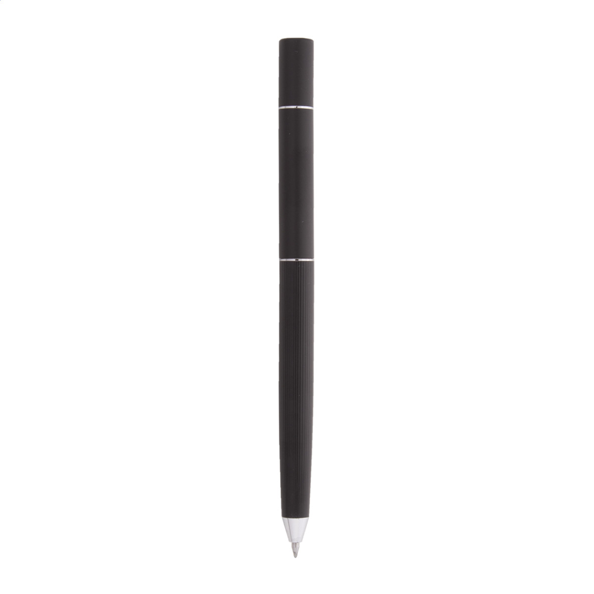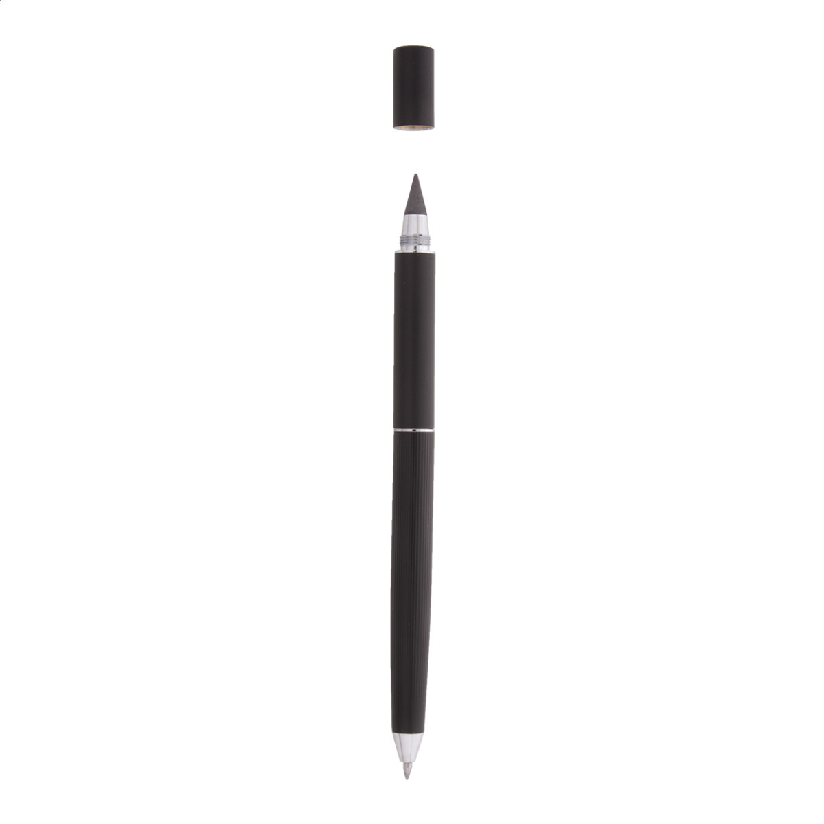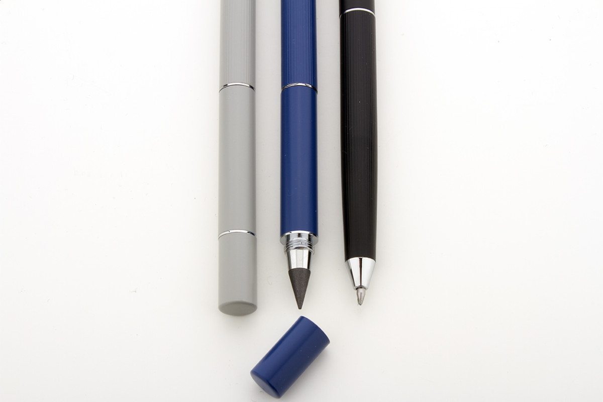 Többfunkciós fém toll. Egyik oldalán tekerős golyóstollal, kék tollbetéttel, másik oldalán tintamentes tollal és fémötvözet heggyel, amely oxidálja a papírt. Ez a toll a ceruzához hasonlóan ír, és radírozható is. Fekete díszdobozban szállítjuk. Test - jobbkezes (fent)