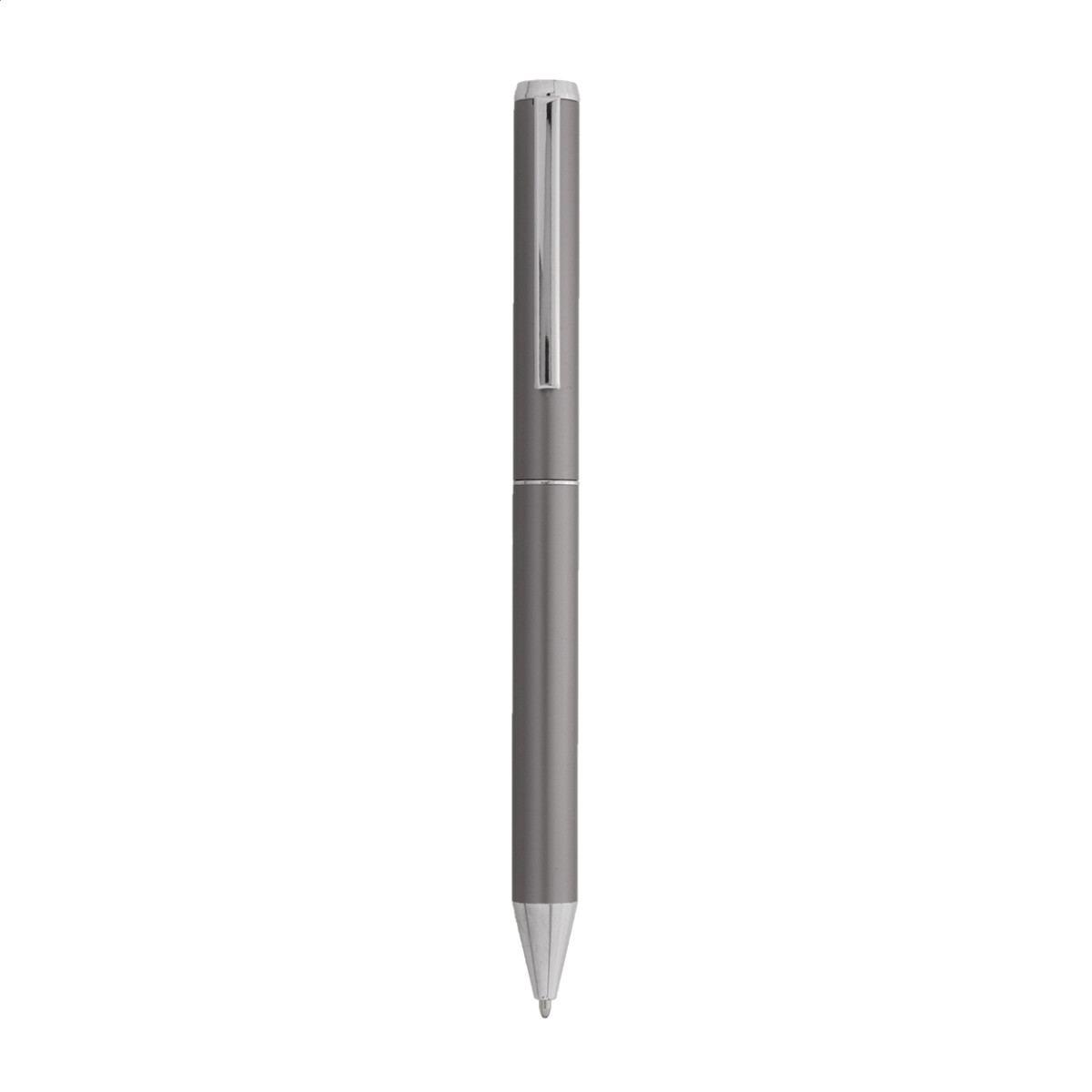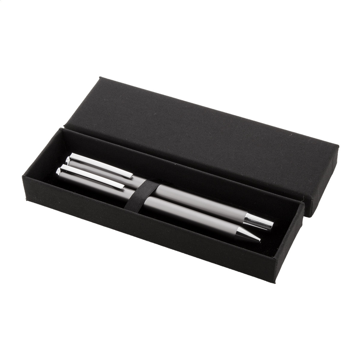 Újrahasznosított alumínium toll szett, golyóstollal és roller tollal. Fekete ajándékdobozban, kék tollbetéttel szállítjuk.