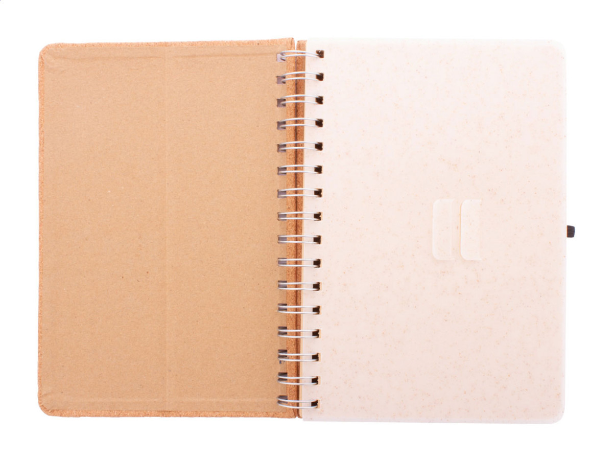 Természetes parafa borítású spirál jegyzetfüzet, búzaszalma műanyag telefon- és tablettartó betéttel. 70 újrahasznosított kraft papírból készült vonalas lappal, gumis pánttal és tolltartóval. A5 méretű. Hátulja