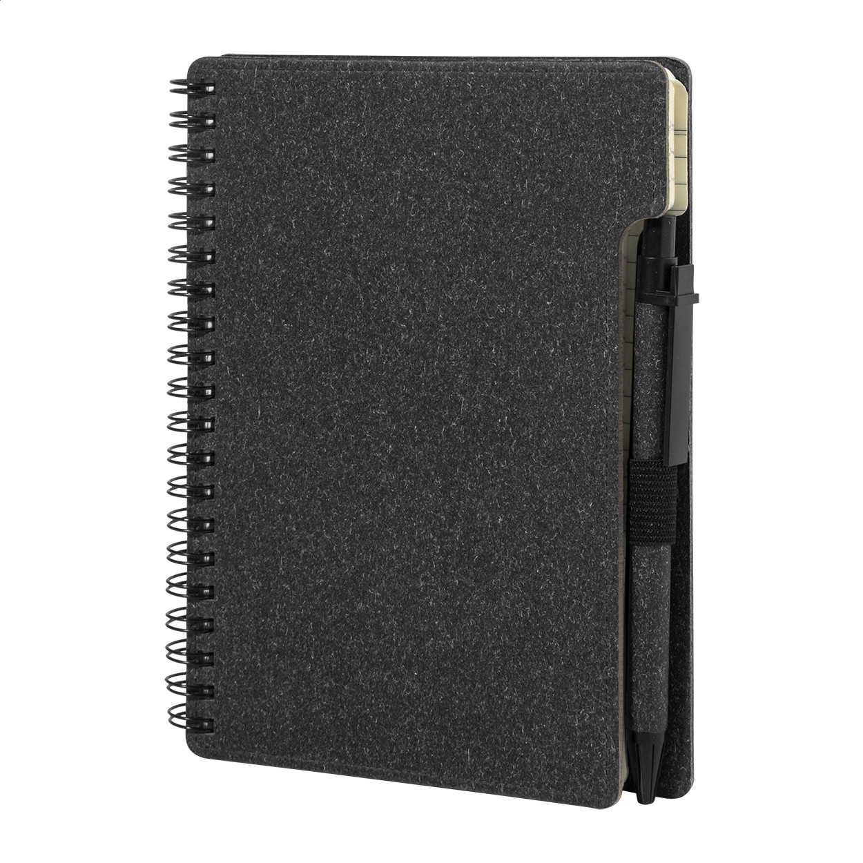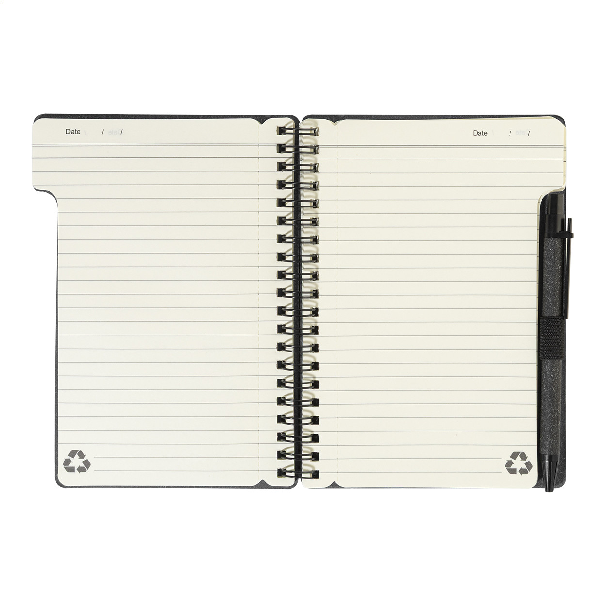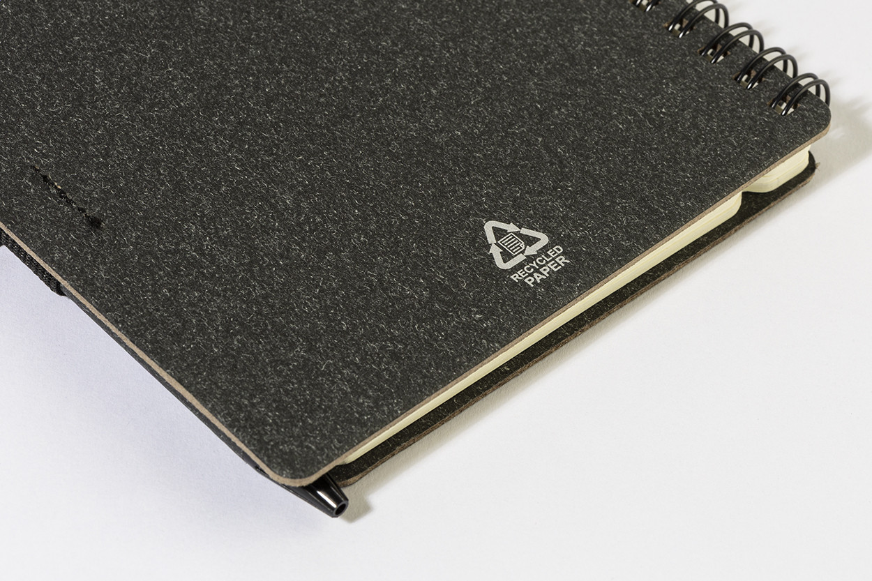 Újrahasznosított papír spirál jegyzetfüzet 80 vonalas lappal. A6 méretű. Tartalmaz egy újrahasznosított papír és újrahasznosított PP anyagú golyóstollat kék tollbetéttel. Eleje