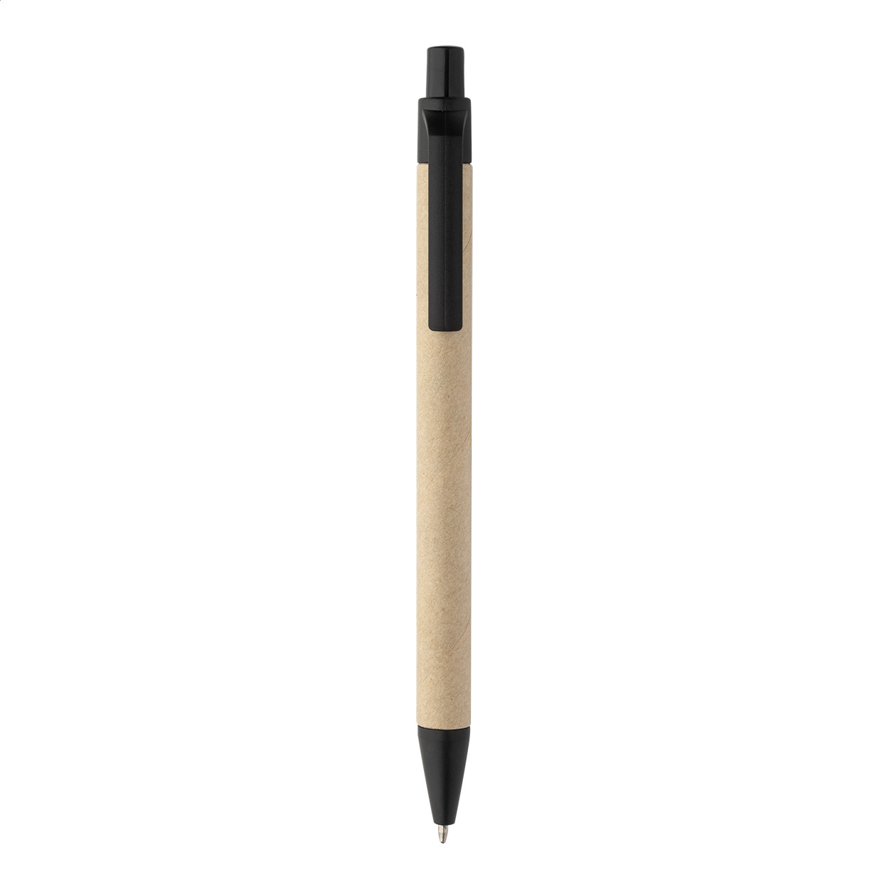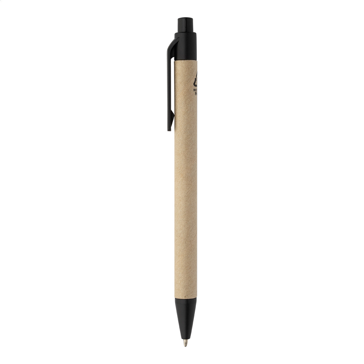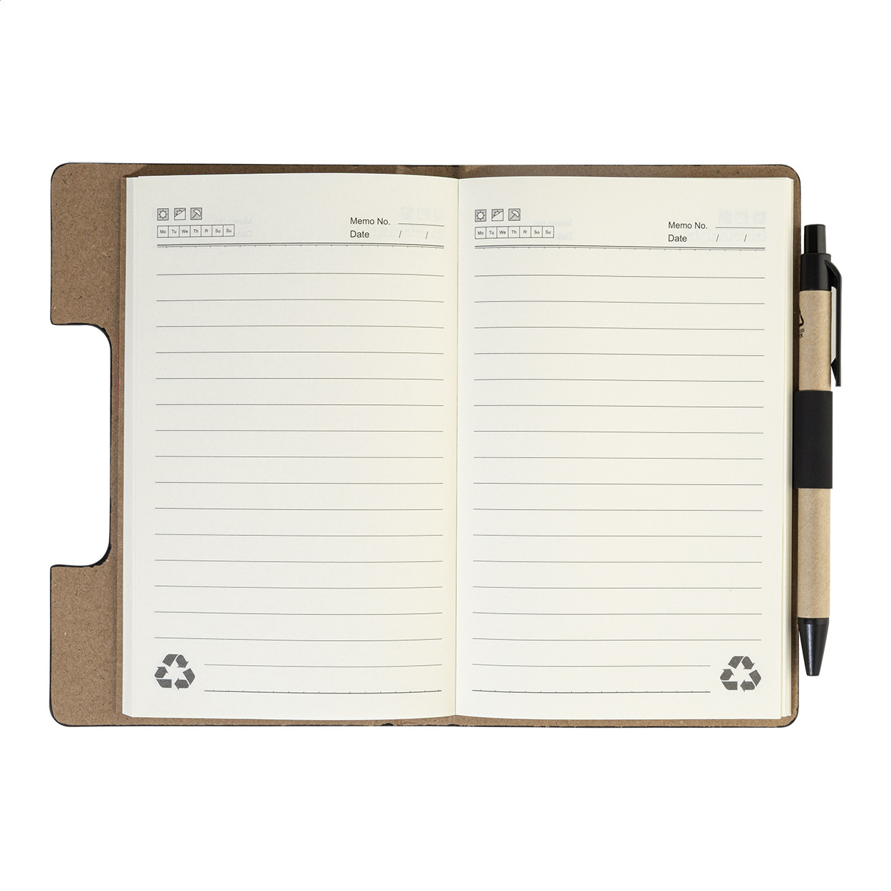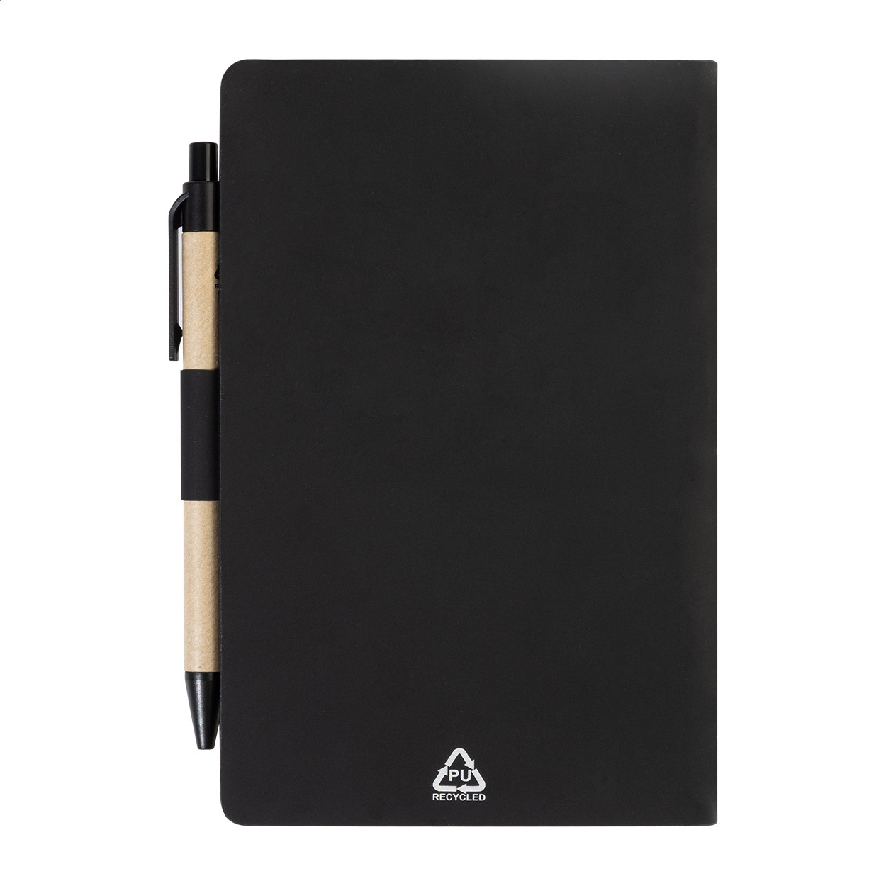 Újrahasznosított PU műbőrrel borított jegyzetfüzet 70 vonalas lappal újrahasznosított papírból és 125 oldaljelölővel (5 különböző színben). Tartalmaz egy újrahasznosított papír és újrahasznosított PP anyagú golyóstollat kék tollbetéttel. Eleje