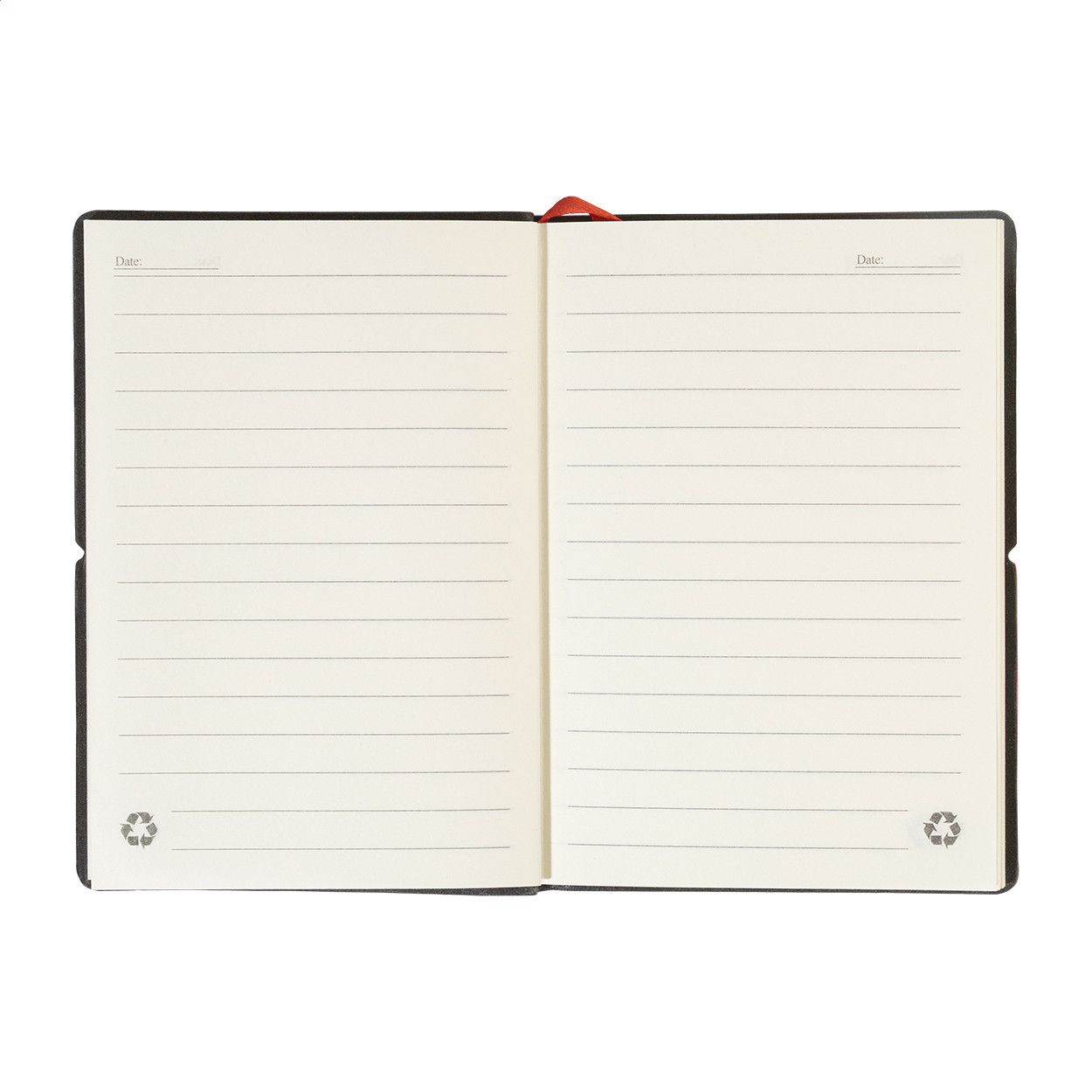 Újrahasznosított PU műbőrrel borított jegyzetfüzet 70 vonalas lappal, 25 öntapadós jegyzetlappal és 125 oldaljelölővel (5 különböző színben). Könyvjelzővel és vízszintes gumipánttal. A6-os méret. Eleje - teteje