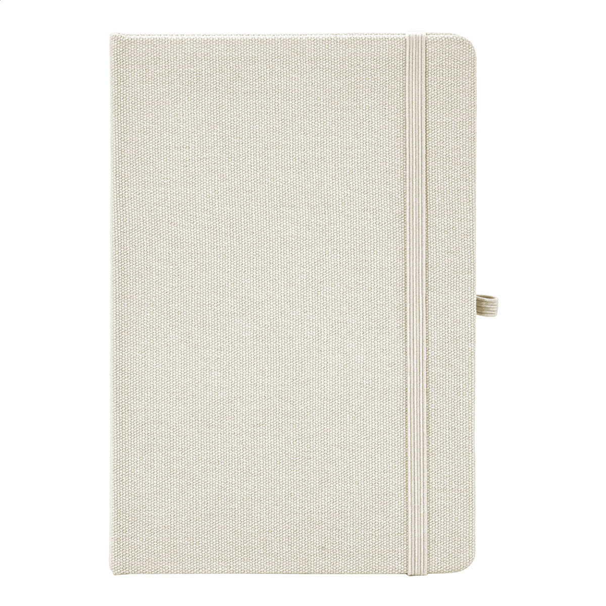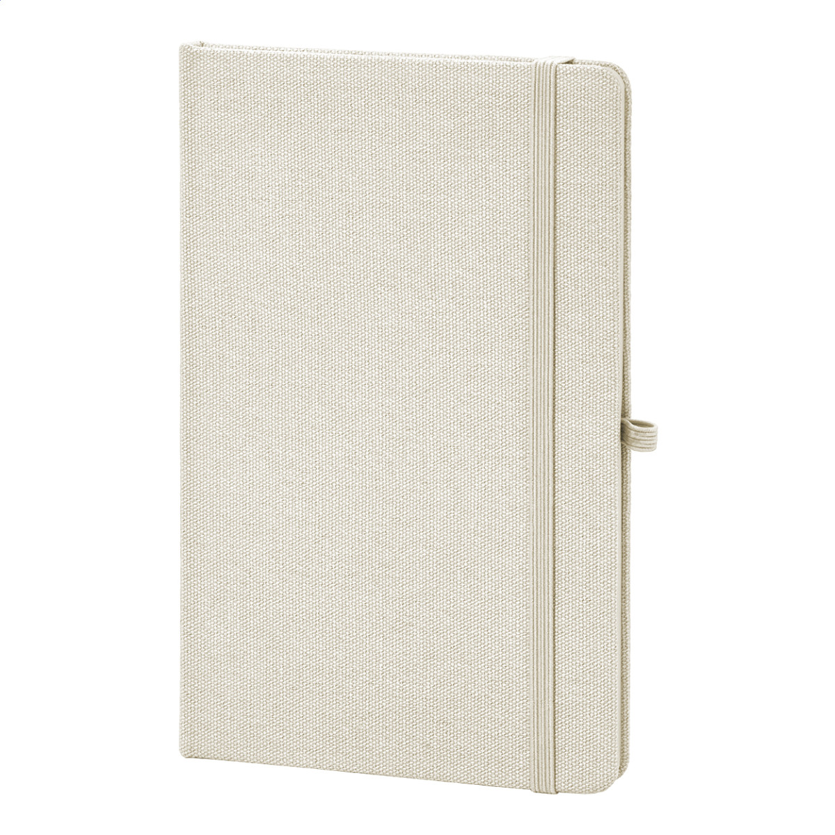 Újrahasznosított pamut borítású jegyzetfüzet 80 vonalas lappal, újrahasznosított papírból. Megegyező színű könyvjelzővel, gumiszalaggal és tolltartóval. A5 méretű. Eleje