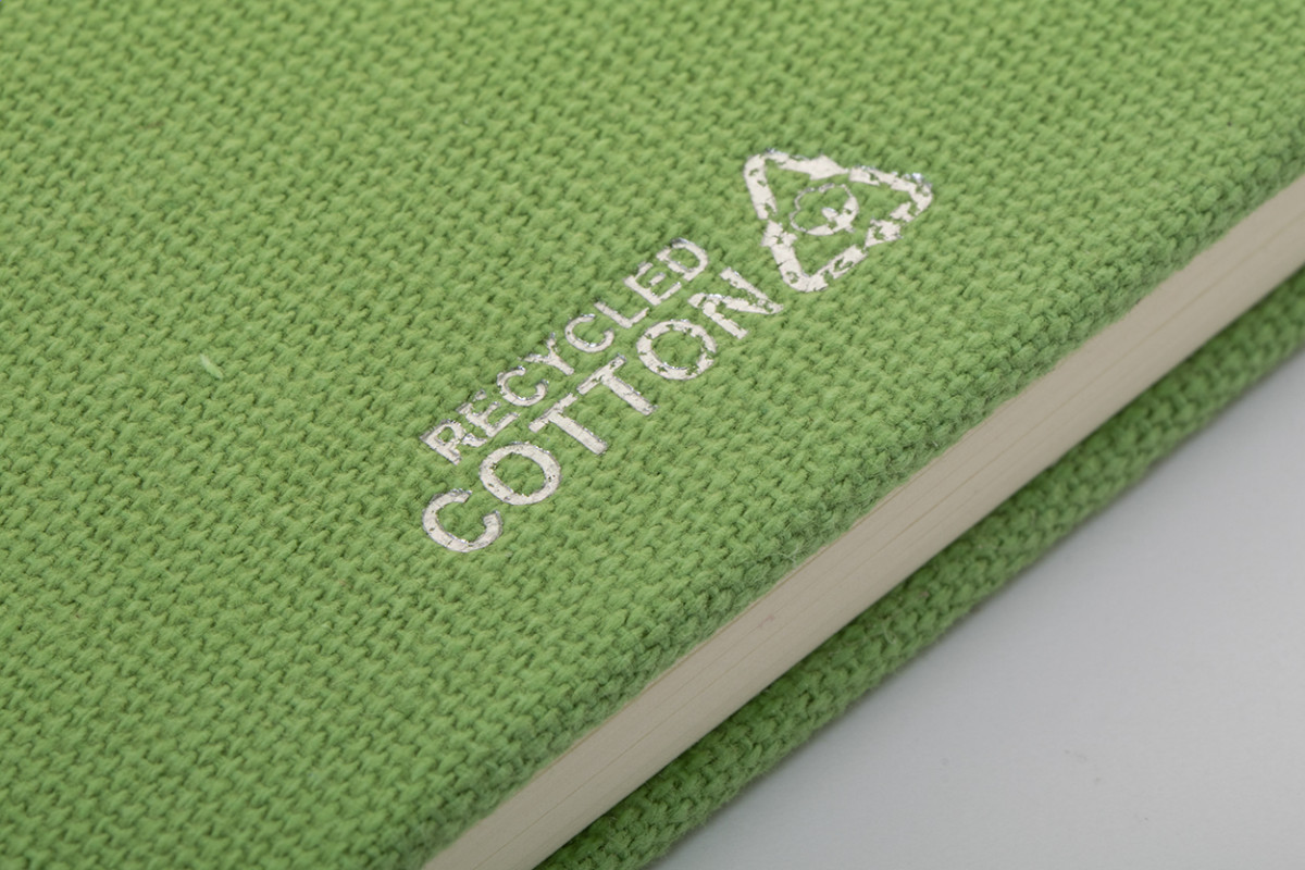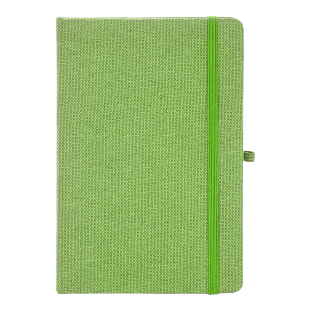 Újrahasznosított pamut borítású jegyzetfüzet 80 vonalas lappal, újrahasznosított papírból. Megegyező színű könyvjelzővel, gumiszalaggal és tolltartóval. A5 méretű. Eleje