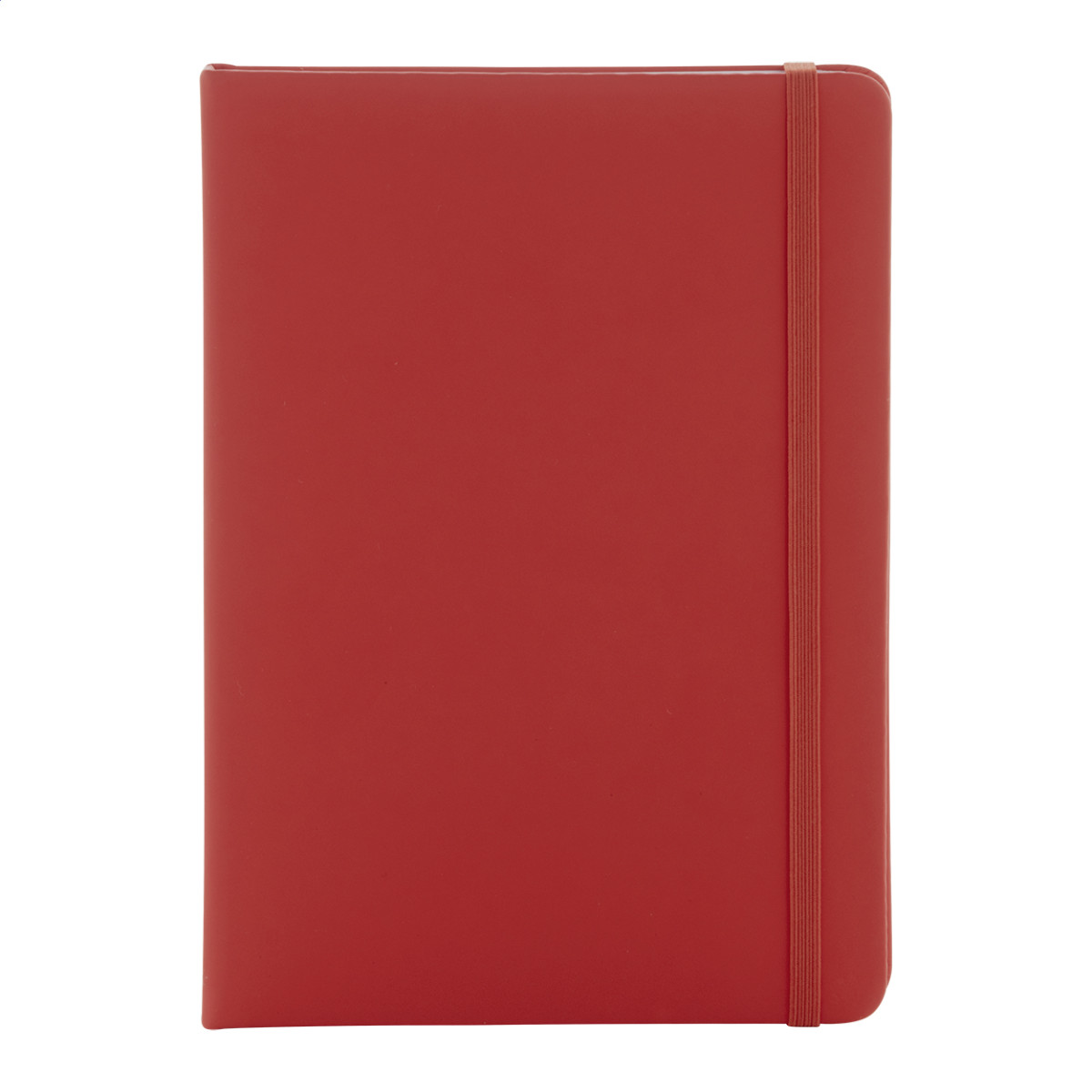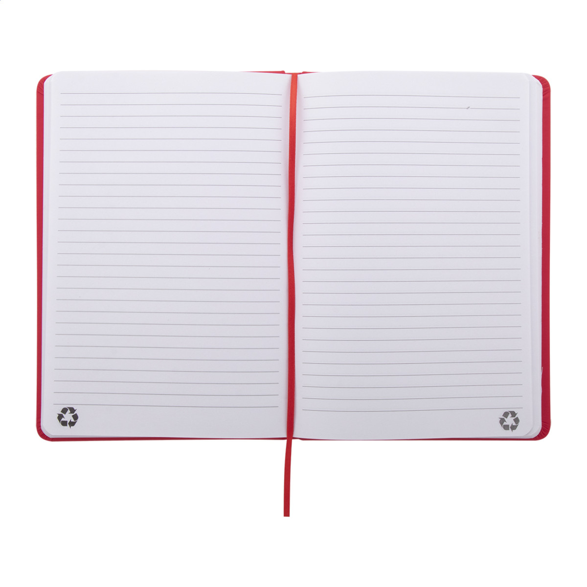 Újrahasznosított PU bőr borítású jegyzetfüzet 100 vonalas lappal, újrahasznosított papírból. Megegyező színű könyvjelzővel és gumiszalaggal. A5 méretű. Első borító