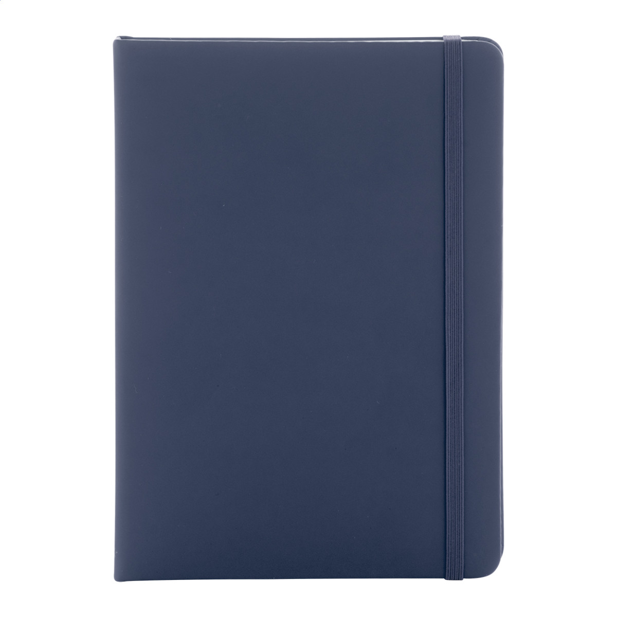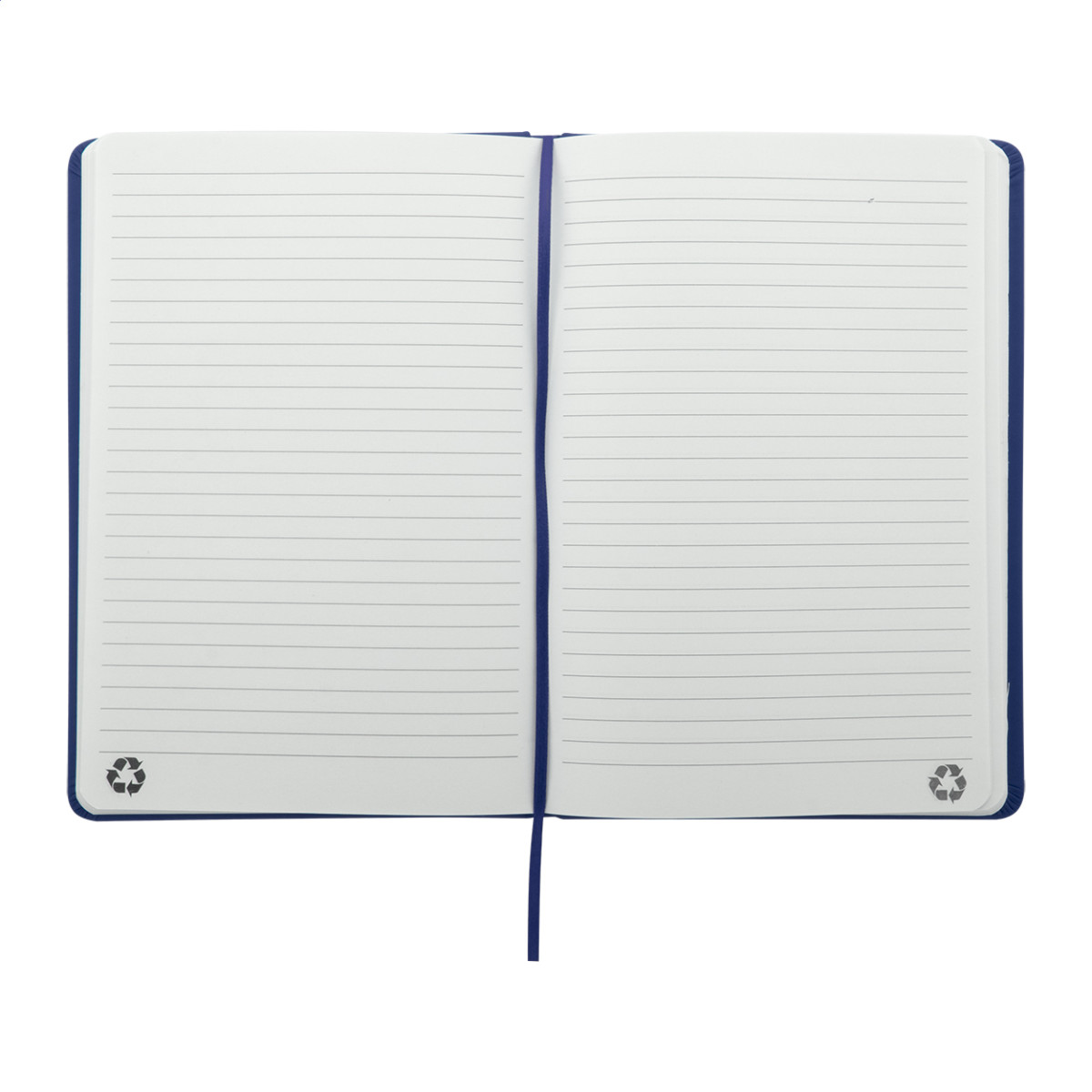 Újrahasznosított PU bőr borítású jegyzetfüzet 100 vonalas lappal, újrahasznosított papírból. Megegyező színű könyvjelzővel és gumiszalaggal. A5 méretű. Első borító