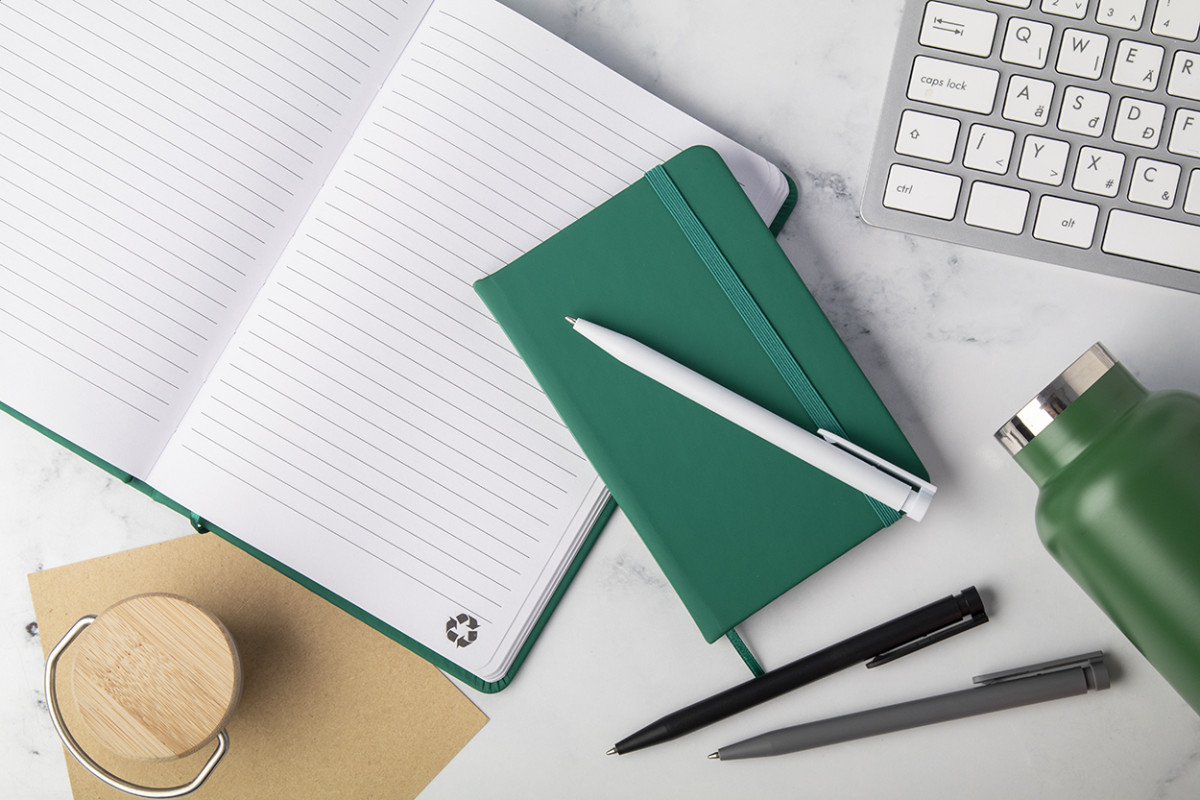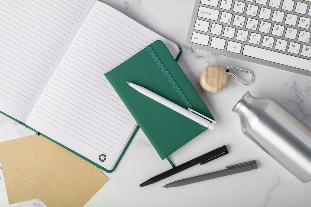 Újrahasznosított PU bőr borítású jegyzetfüzet 100 vonalas lappal, újrahasznosított papírból. Megegyező színű könyvjelzővel és gumiszalaggal. A6 méretű. Eleje