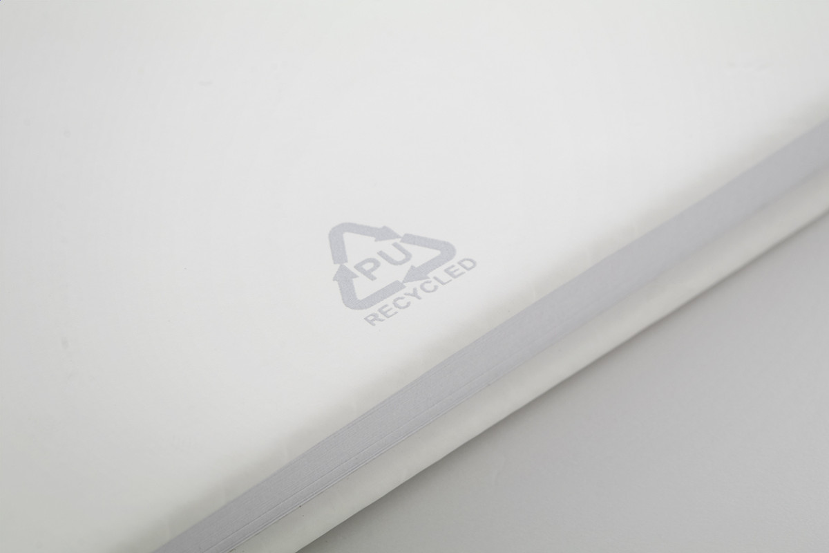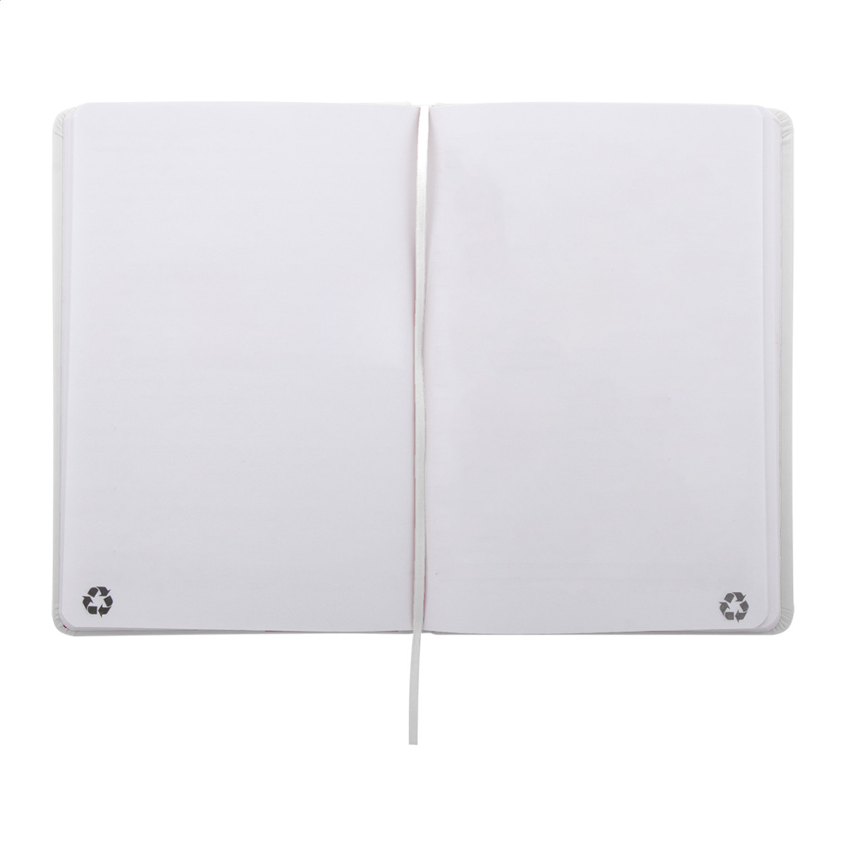 Úrahasznosított PU bőr borítású jegyzetfüzet újrahasznosított papírból készült 100 sima lappal. Hozzáillő színű gumipánttal és könyvjelzővel. A5 méretű. Eleje