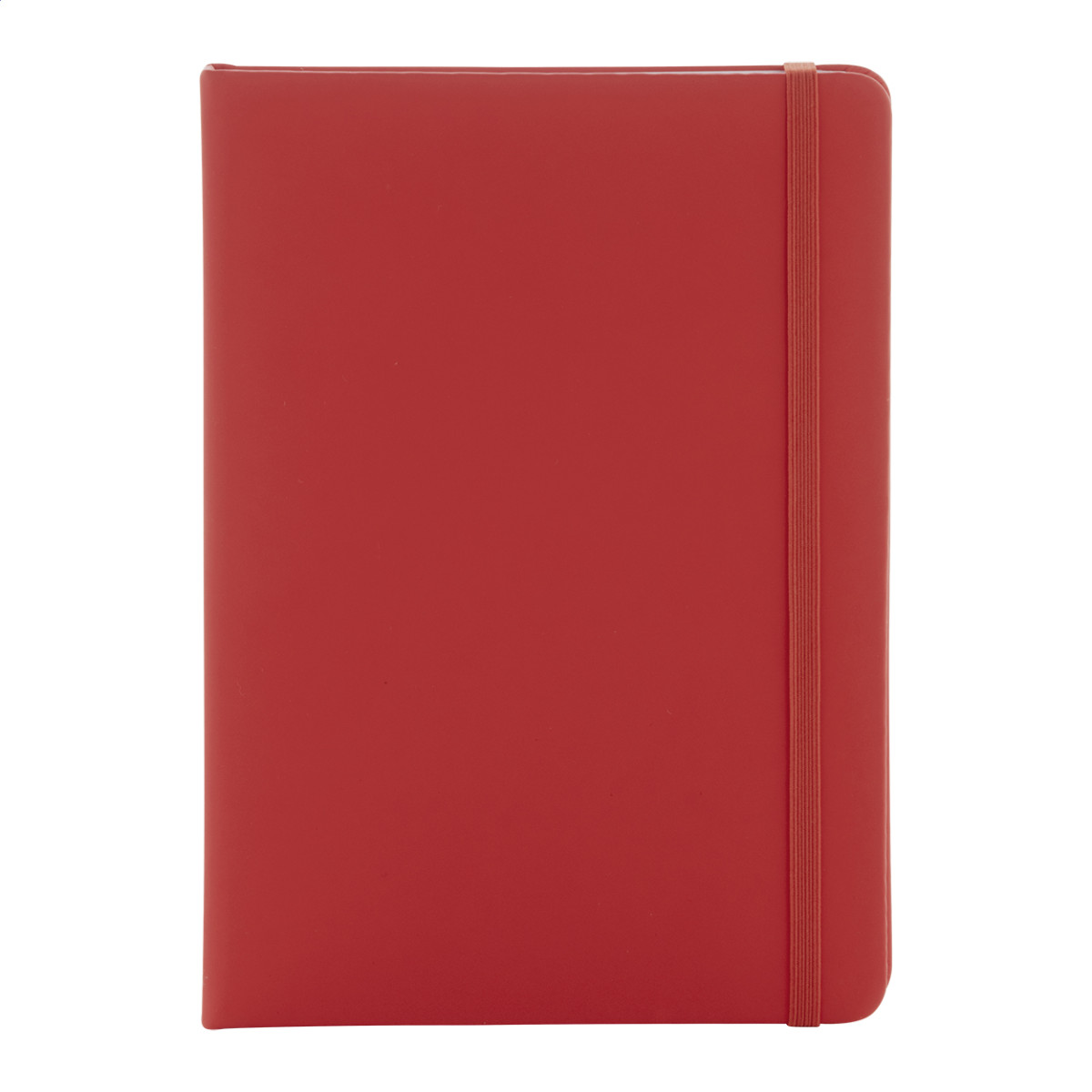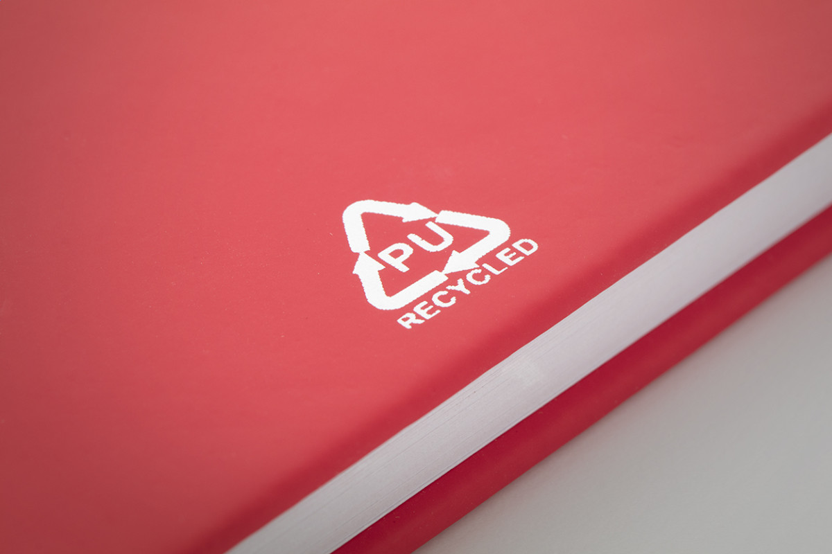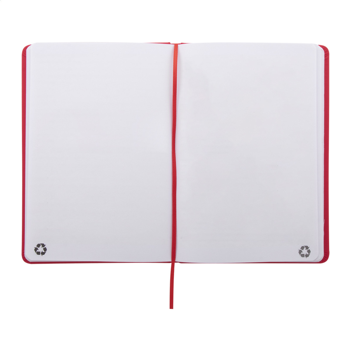 Úrahasznosított PU bőr borítású jegyzetfüzet újrahasznosított papírból készült 100 sima lappal. Hozzáillő színű gumipánttal és könyvjelzővel. A5 méretű. Eleje