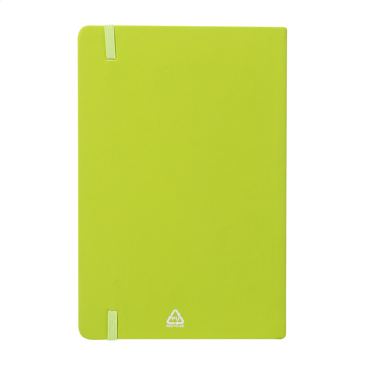 Úrahasznosított PU bőr borítású jegyzetfüzet újrahasznosított papírból készült 100 sima lappal. Hozzáillő színű gumipánttal és könyvjelzővel. A5 méretű. Eleje