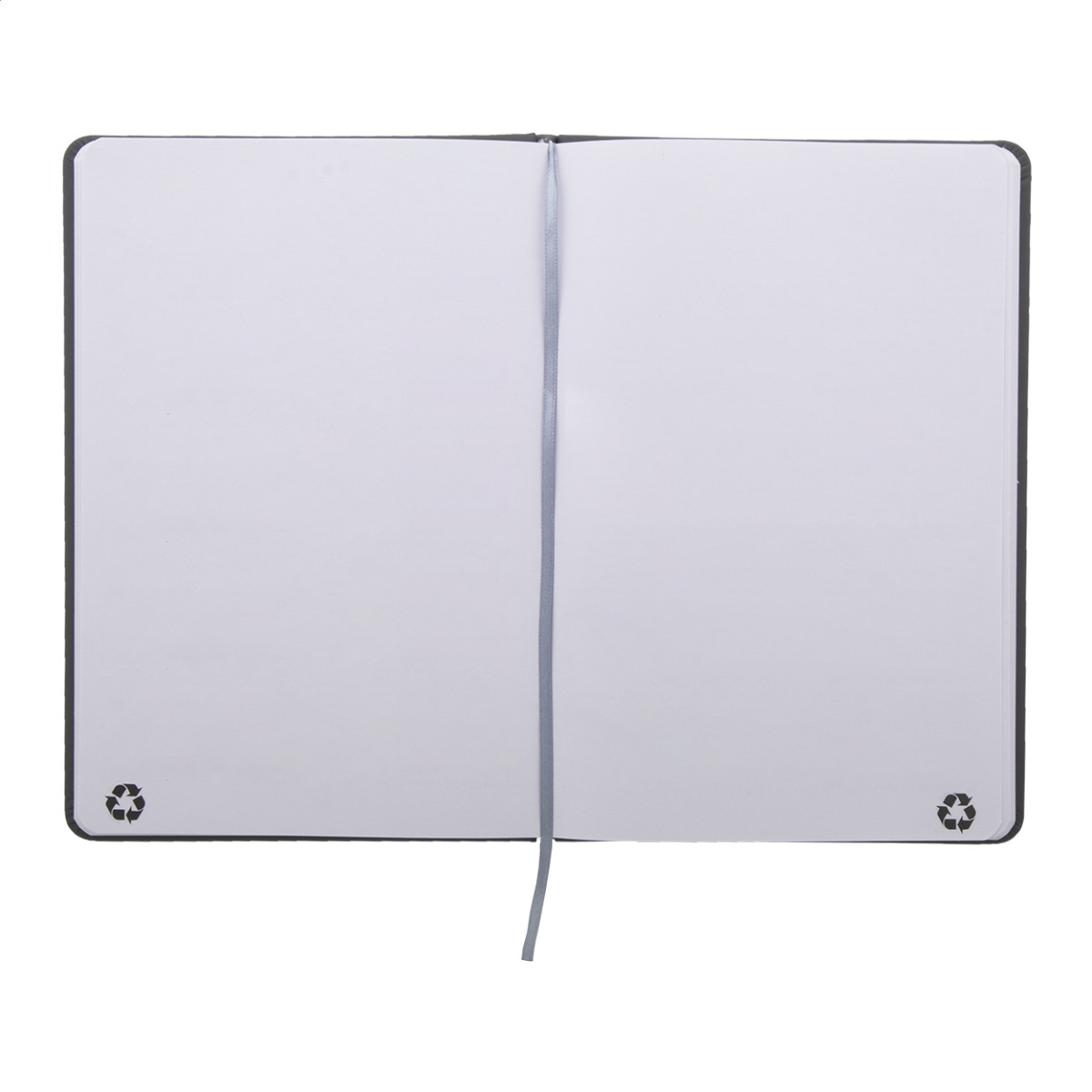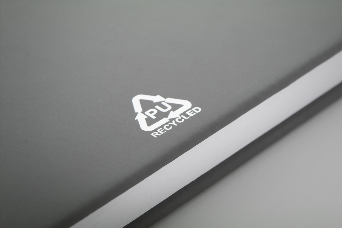 Úrahasznosított PU bőr borítású jegyzetfüzet újrahasznosított papírból készült 100 sima lappal. Hozzáillő színű gumipánttal és könyvjelzővel. A5 méretű. Eleje